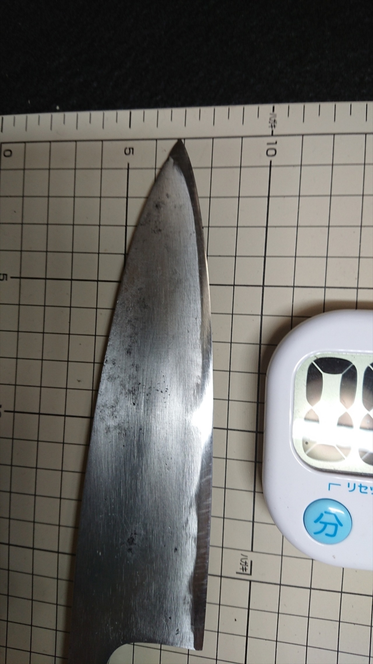 他 :曲がり無し。刃こぼれ無し。腐食やサビは可能な限り除去済み(痕あり)。刃線付近に取り切れない腐食痕が一部あるため、該当箇所は若干引っかかりあり。普通に料理するには、とくに気にならないレベルかと思います。