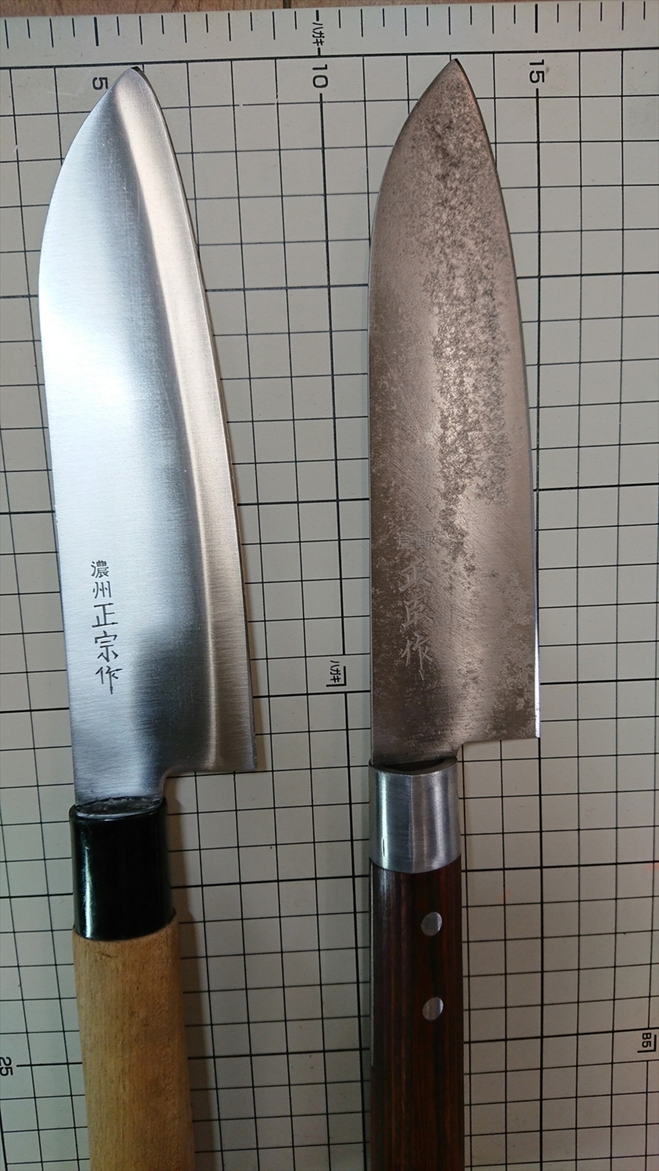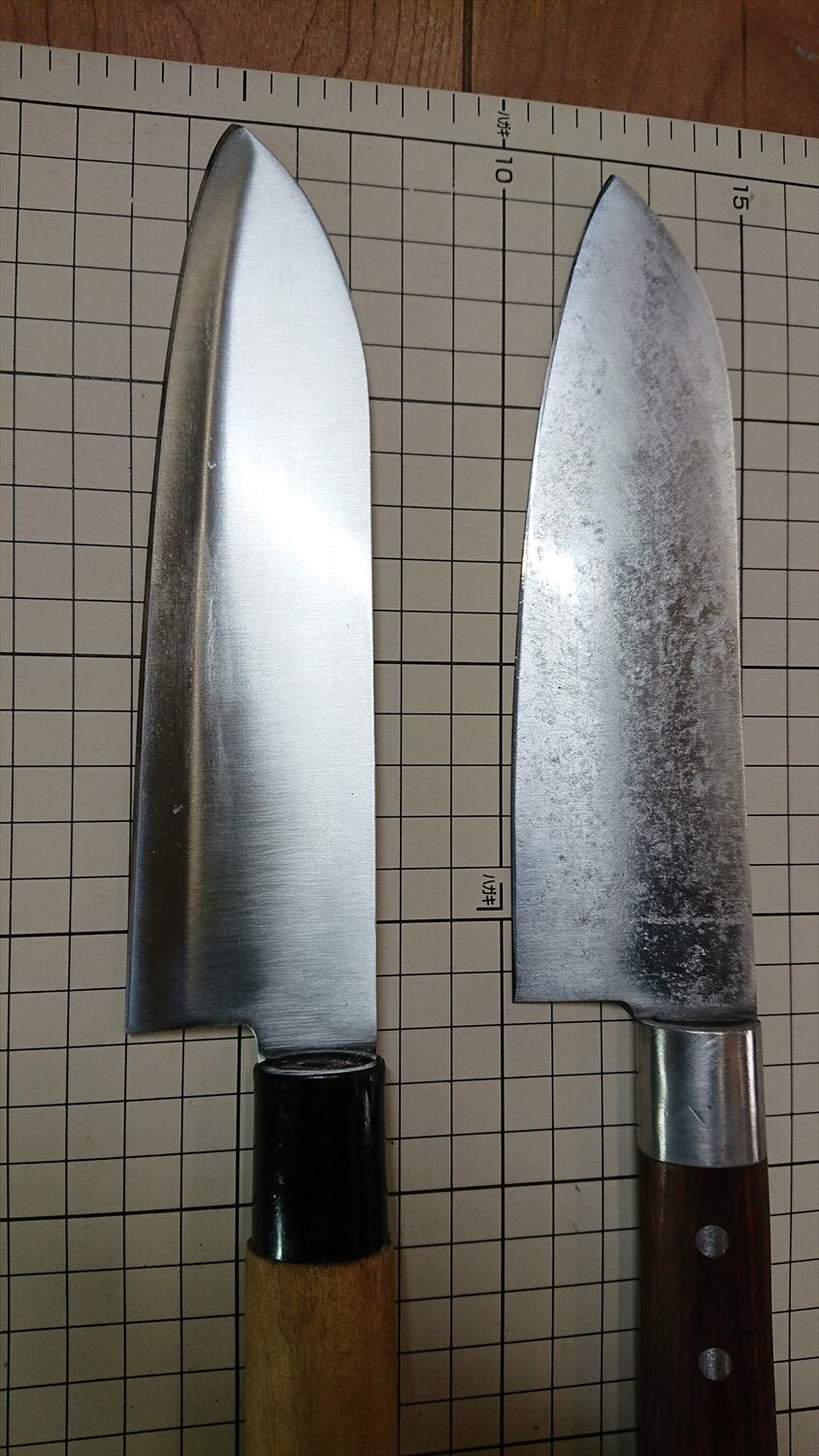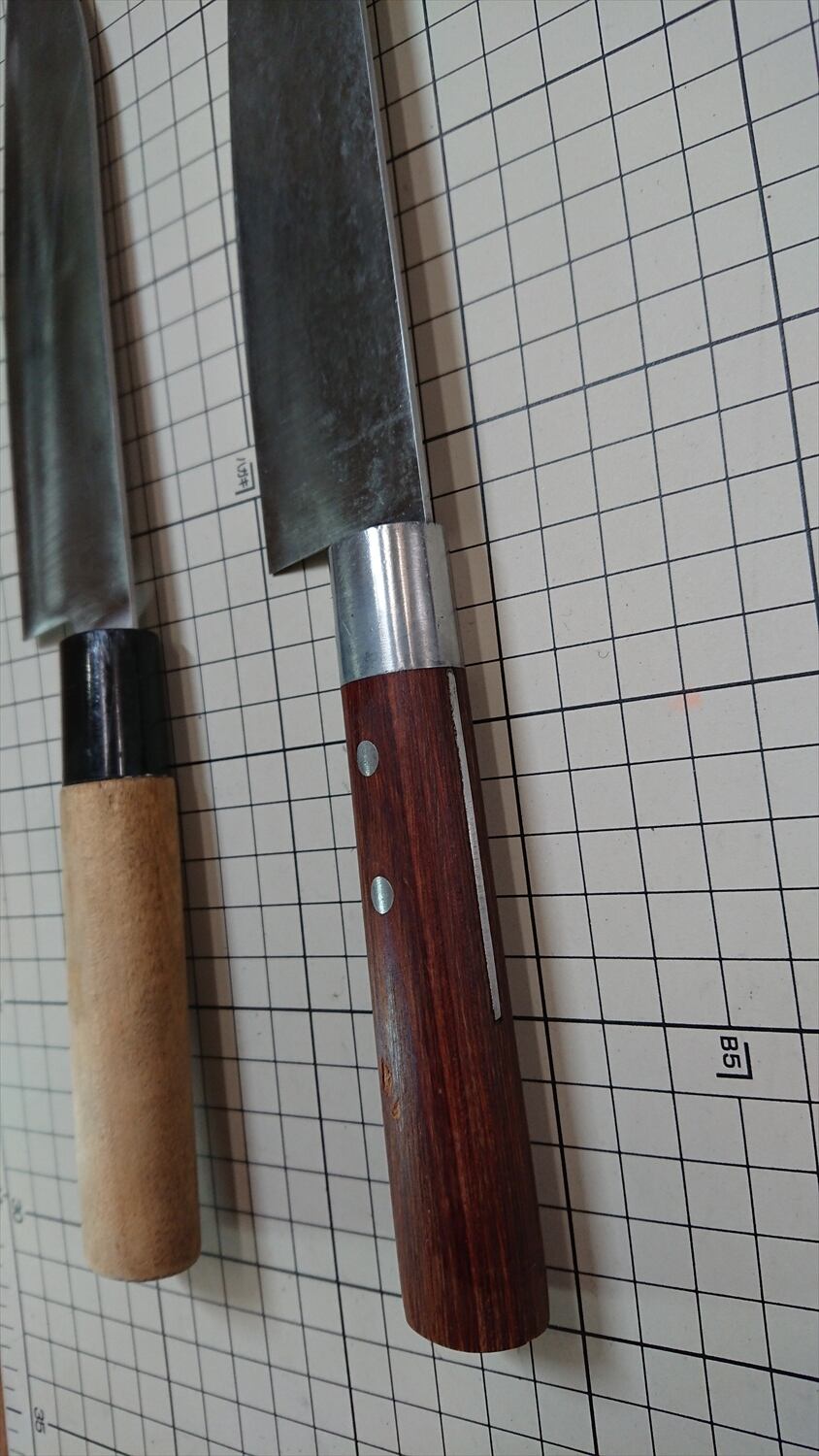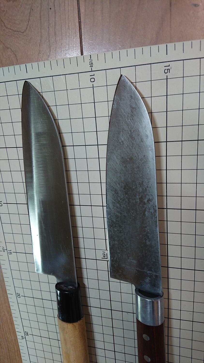 ・商品によっては刃線付近に取り切れない腐食痕があり、一部若干の引っかかりがある場合があります。普通に料理するには気にならないレベルかと思います。また、曲がりや反りがあるものはできる限り直線に修正しておりますが、機械加工のような真直線にはなりません。また、修正しても保管中に微妙に曲がりや反りが出る場合があります。中古品包丁の性質上ご理解ください。