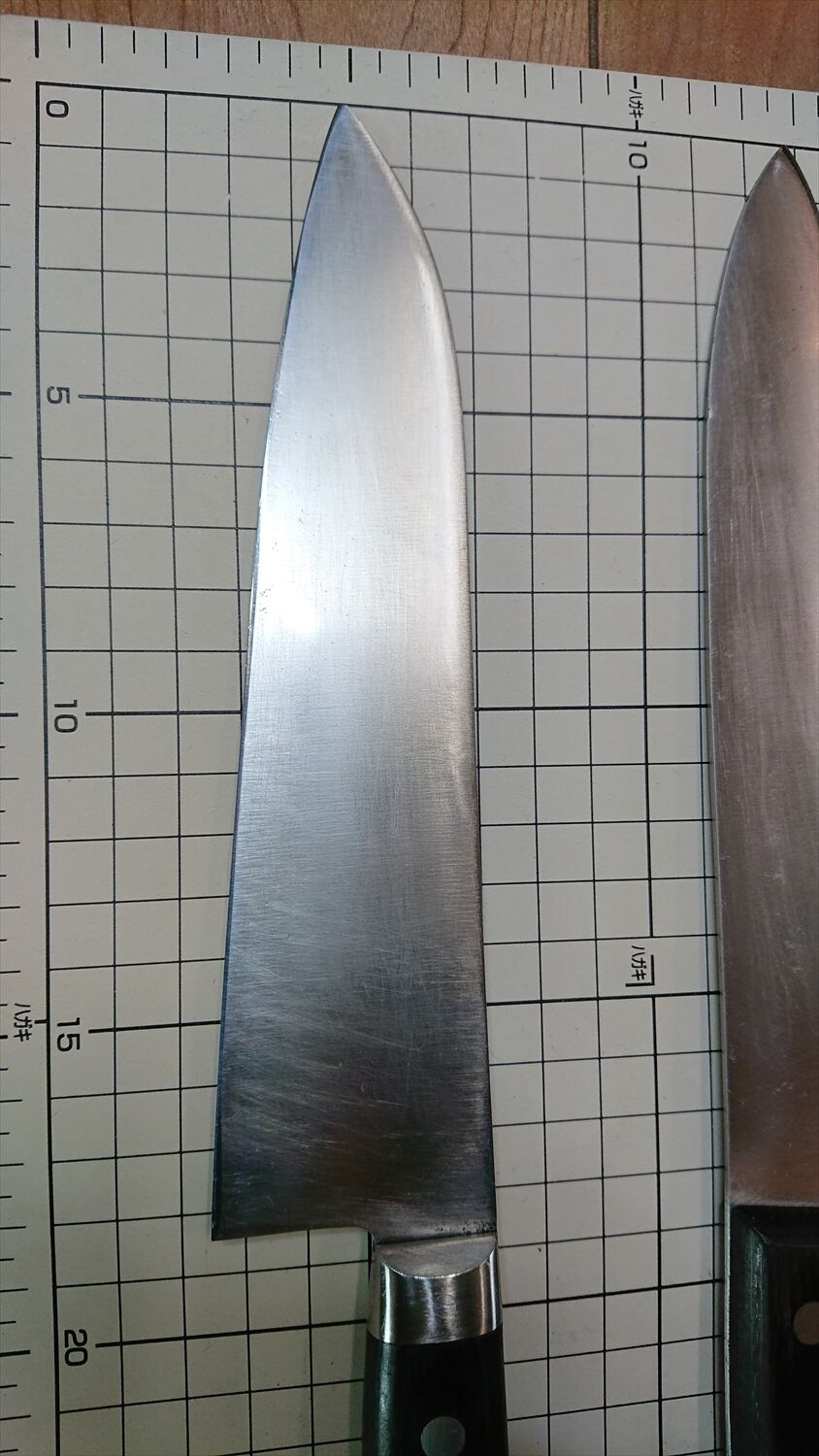 ・商品によっては刃線付近に取り切れない腐食痕があり、一部若干の引っかかりがある場合があります。普通に料理するには気にならないレベルかと思います。また、曲がりや反りがあるものはできる限り直線に修正しておりますが、機械加工のような真直線にはなりません。また、修正しても保管中に微妙に曲がりや反りが出る場合があります。中古品包丁の性質上ご理解ください。
