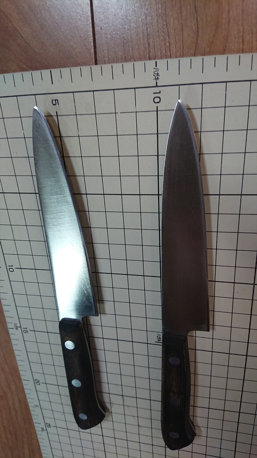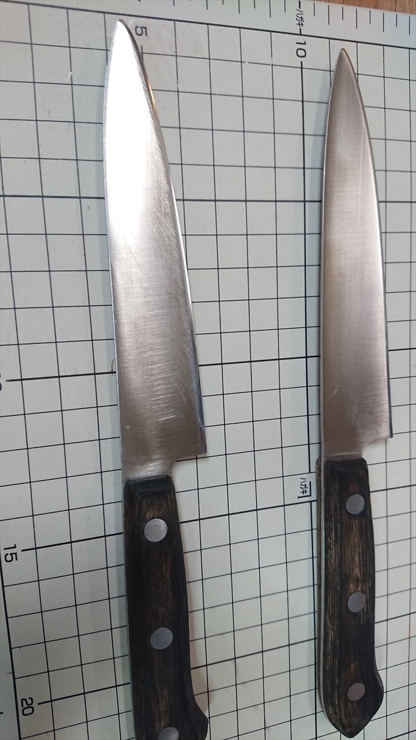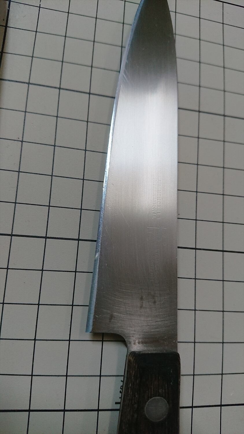 ・商品によっては刃線付近に取り切れない腐食痕が残り、若干の引っかかりがある場合があります。また、保管中に微妙に曲がりや反りが出る場合が稀にあります。中古包丁の性質上ご理解ください。