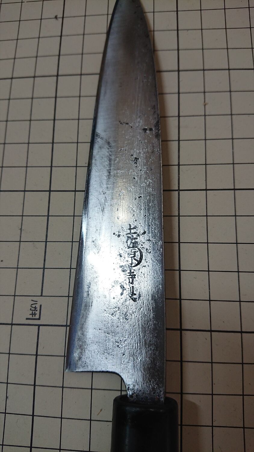 ・商品によっては刃線付近に取り切れない腐食痕が残り、若干の引っかかりがある場合があります。また、保管中に微妙に曲がりや反りが出る場合が稀にあります。中古包丁の性質上ご理解ください。