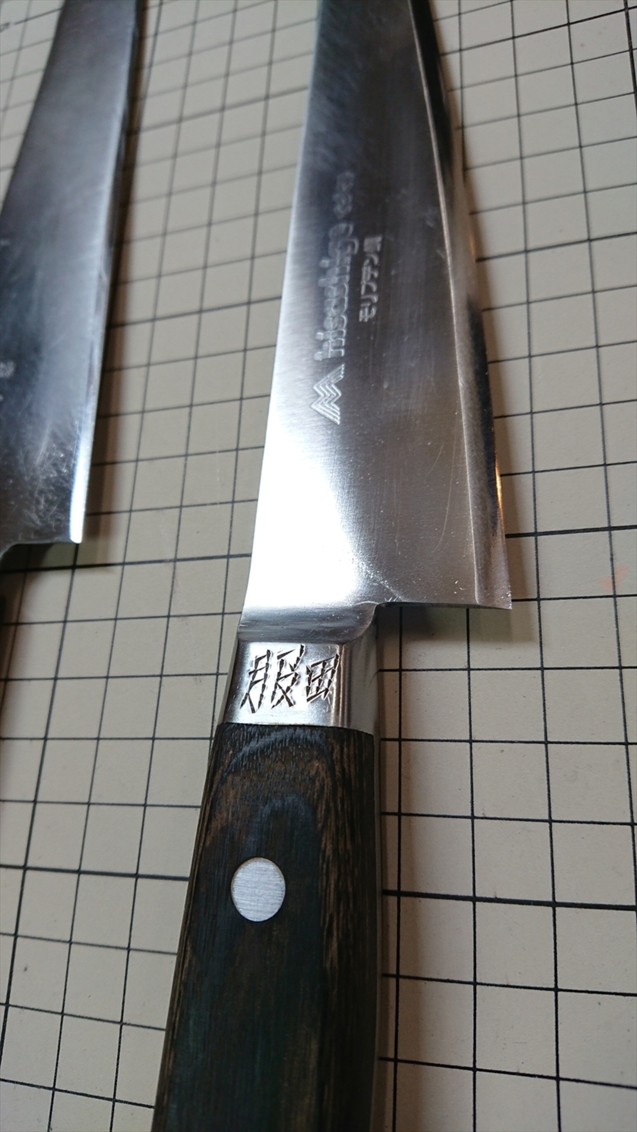 ・商品によっては刃線付近に取り切れない腐食痕が残り、若干の引っかかりがある場合があります。また、保管中に微妙に曲がりや反りが出る場合が稀にあります。中古包丁の性質上ご理解ください。