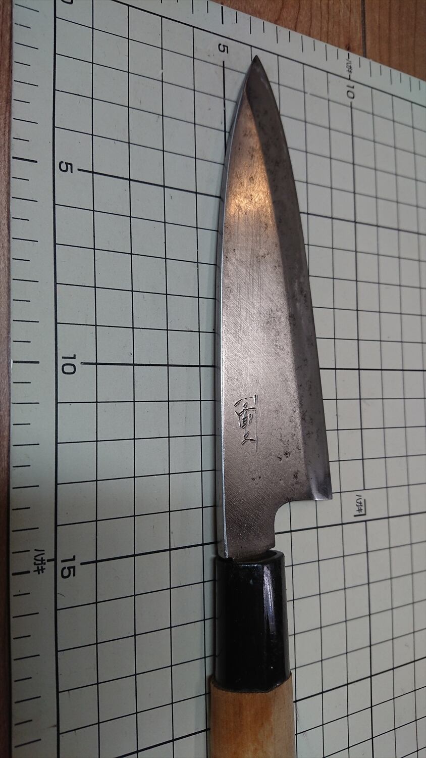 ・商品によっては刃線付近に取り切れない腐食痕が残り、若干の引っかかりがある場合があります。また、保管中に微妙に曲がりや反りが出る場合が稀にあります。中古包丁の性質上ご理解ください。