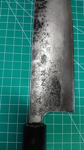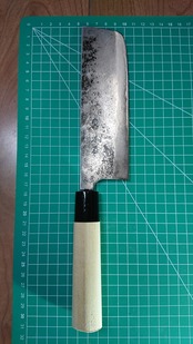 ① o648/銘:木屋 義久/菜切包丁(両刃)/峰厚:4/重量:135/作り:鋼?/他:柄は当方にて新品と交換済み。黒く見える部分は黒塗装の名残(サビではありません)。
