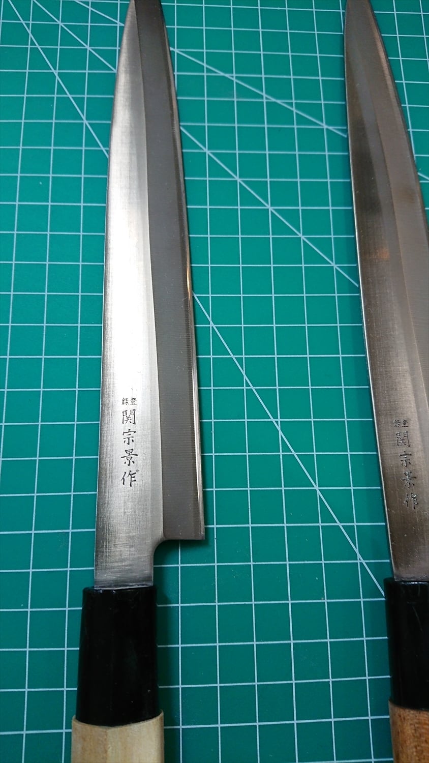 ① o590/銘:関宗景作/刺身包丁(片刃)/峰厚:1.7/重量:75/作り:鋼?/他: