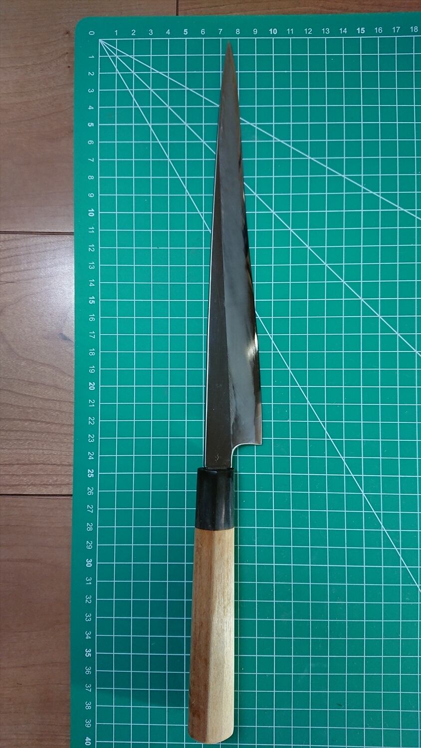 1. o640/銘:源昭忠/刺身包丁(両刃 約9.5:0.5)/峰厚:4.5/重量:140/作り:鋼?/他:柄に長期使用による削れが少々あったが当方にて補修済み