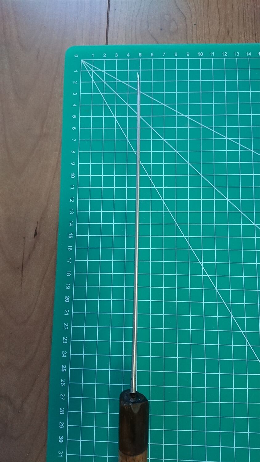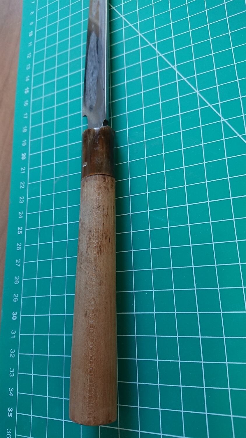 1. o641/銘:?/刺身包丁(片刃)/峰厚:3.3/重量:85/作り:鋼?/他:口輪に虫食いや裂けがあったが当方にて補修済み