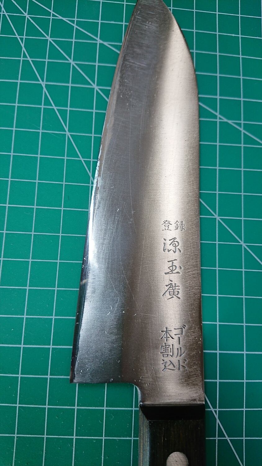 1. o646/銘:源玉廣/三徳包丁(両刃)/峰厚:1.8/重量:138/作り:ゴールド本割込/他: