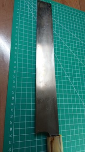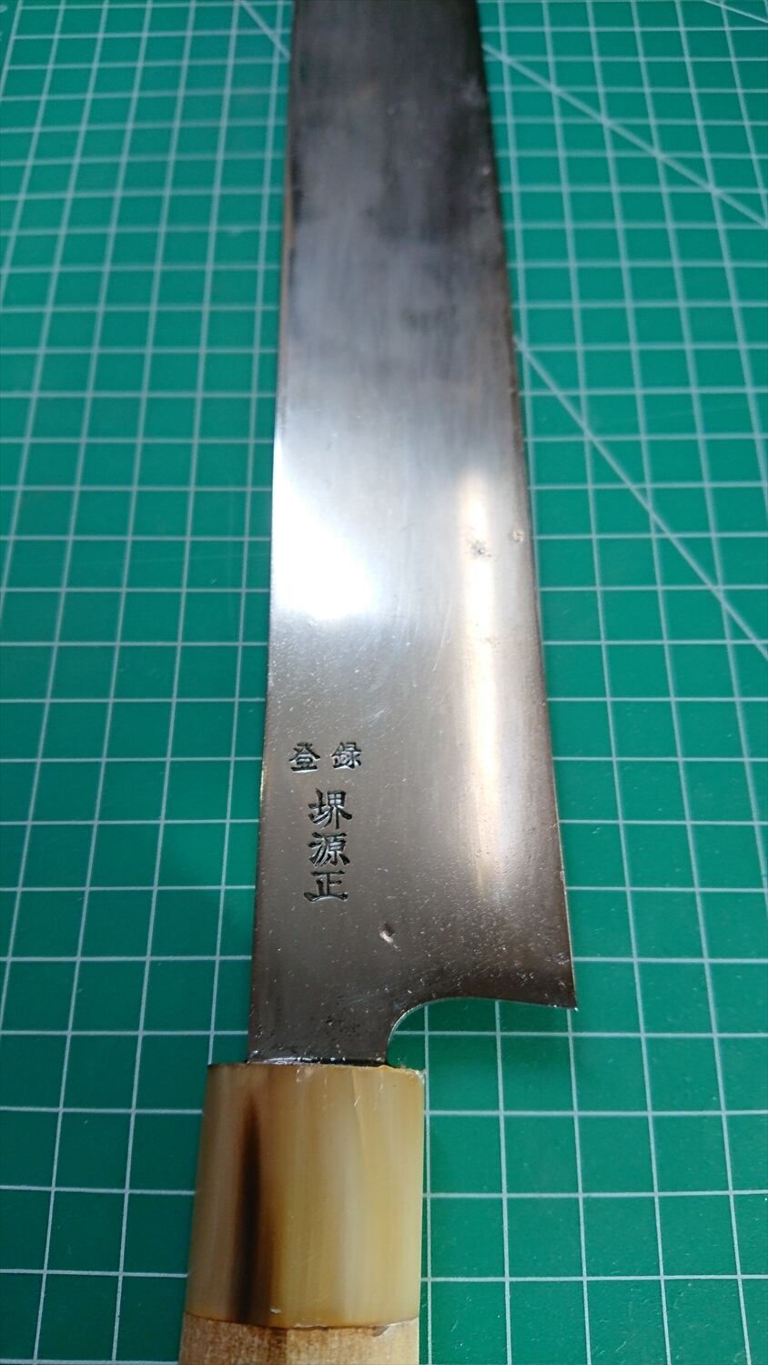 1. o709/銘:堺源正/カステラ包丁?/峰厚:3.8/重量:264/作り:鋼?/他:当方にて刃線を直線に修正済み。刃はついておりません。カステラ等柔らかいものを切る包丁のようです。口輪に割れ、柄に小さな欠けがあったが当方にて補修済
