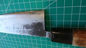 1. o752/銘:盛一/三徳包丁(両刃)/峰厚:3.2/重量:124/作り:鋼? 請合/他:黒い部分は黒塗装の名残(サビではない)