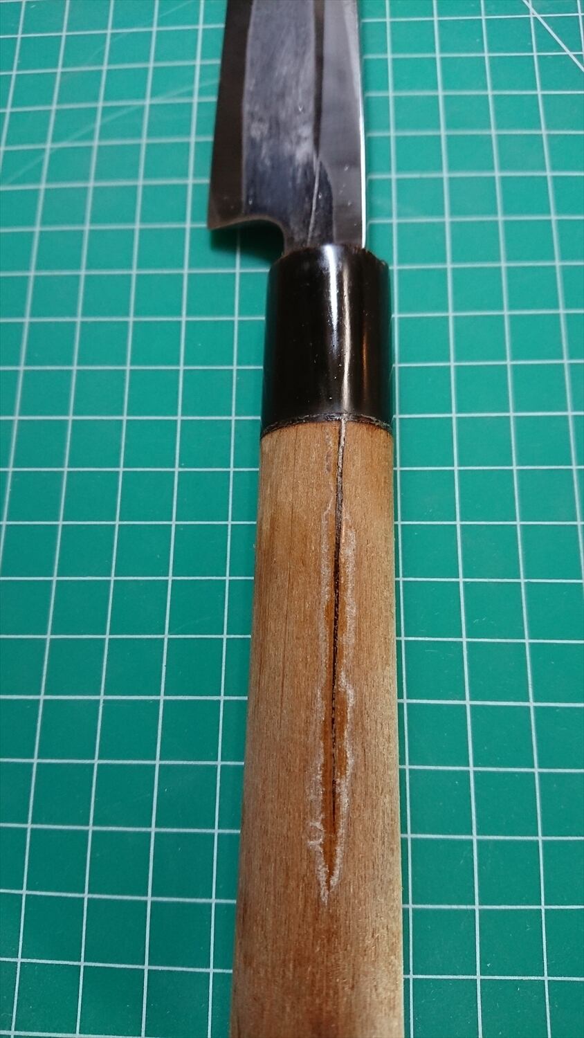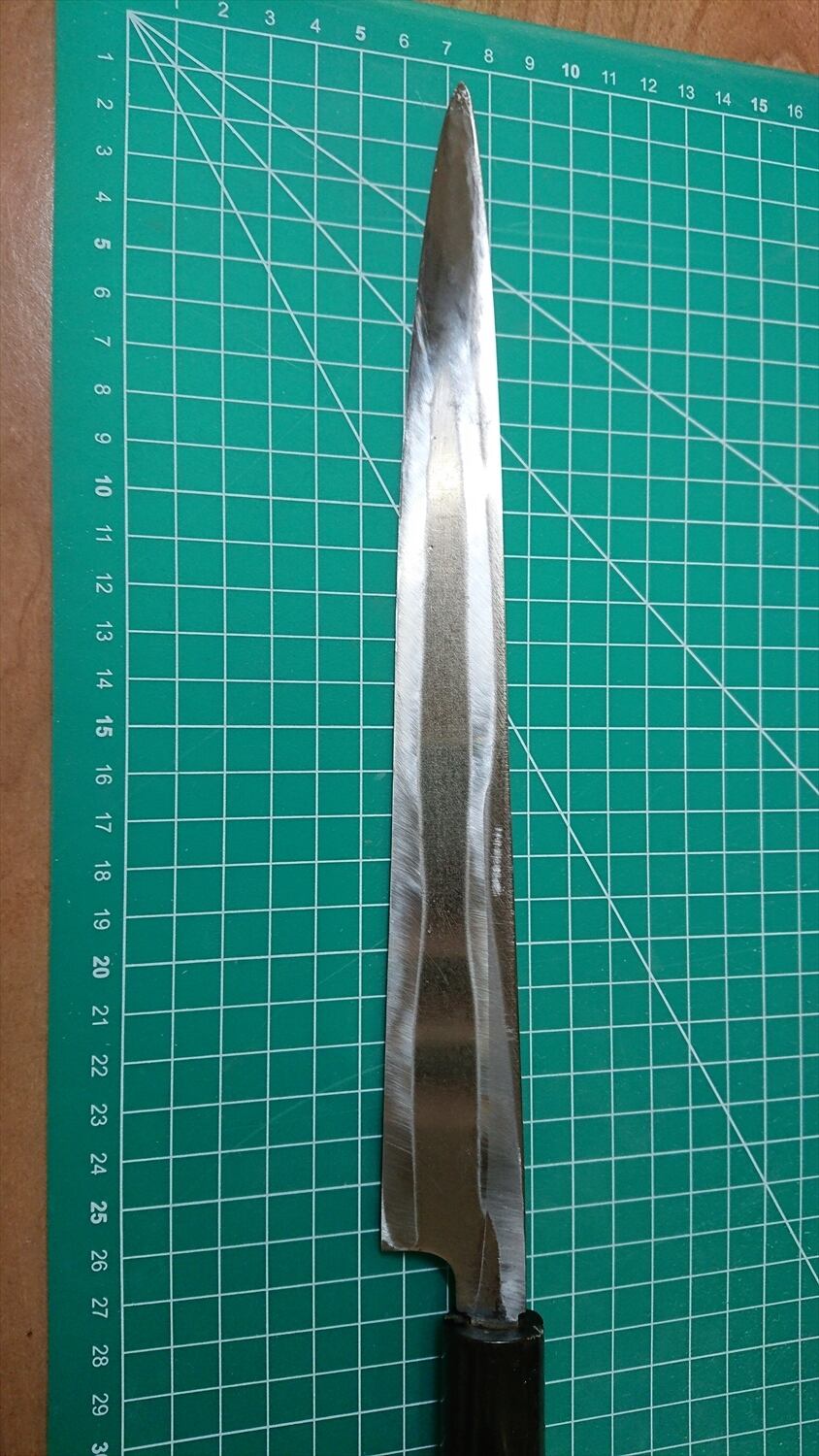 1. o718/銘:正本/刺身包丁(片刃)/峰厚:4.7/重量:175/作り:鋼?/他:柄に少々割れ有り。当方にて補修済み