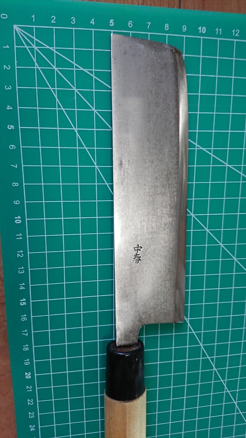 1. o872/銘:中春/菜切包丁(片刃)/峰厚:2.8/重量:143/作り:鋼?/他: