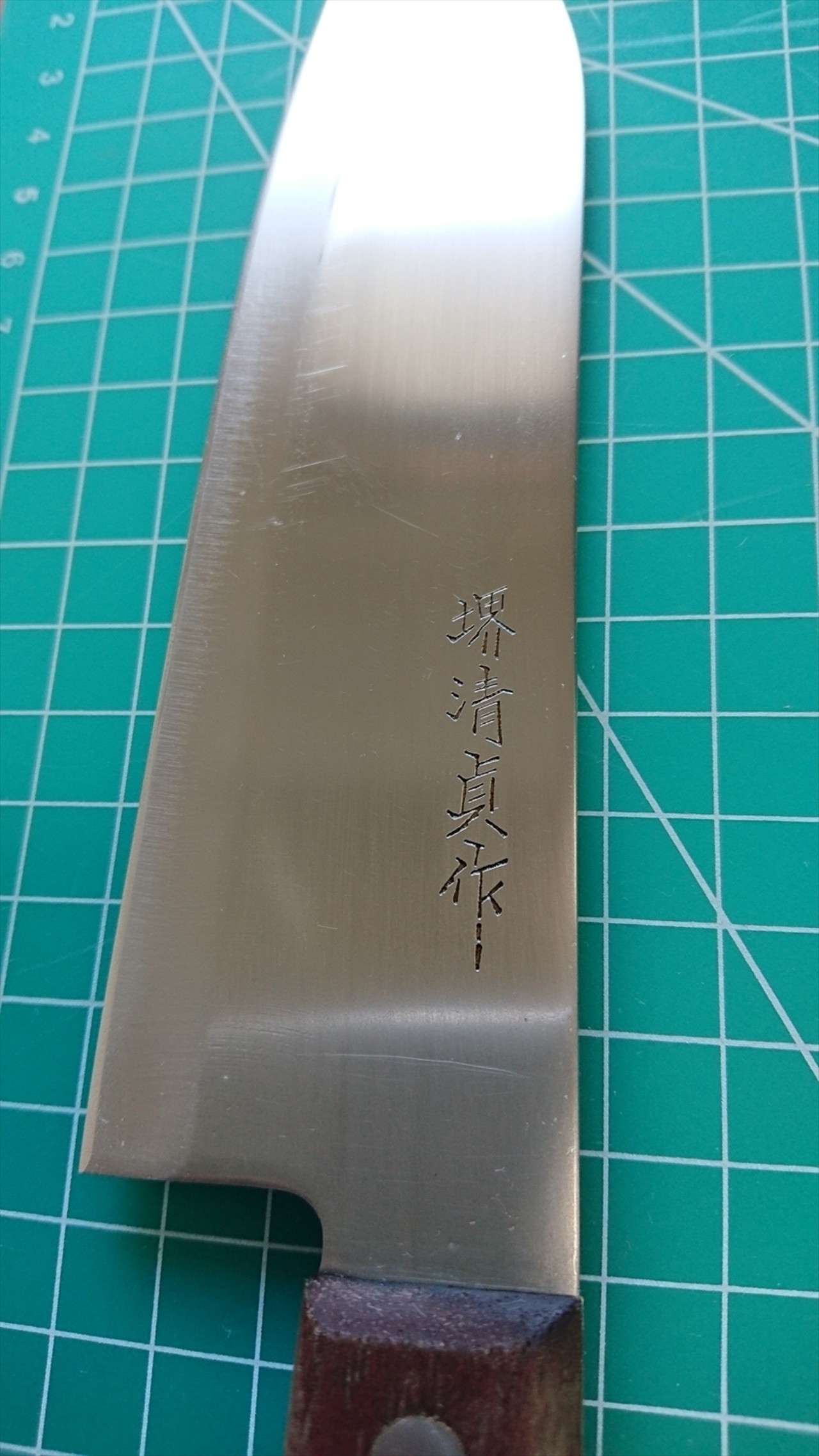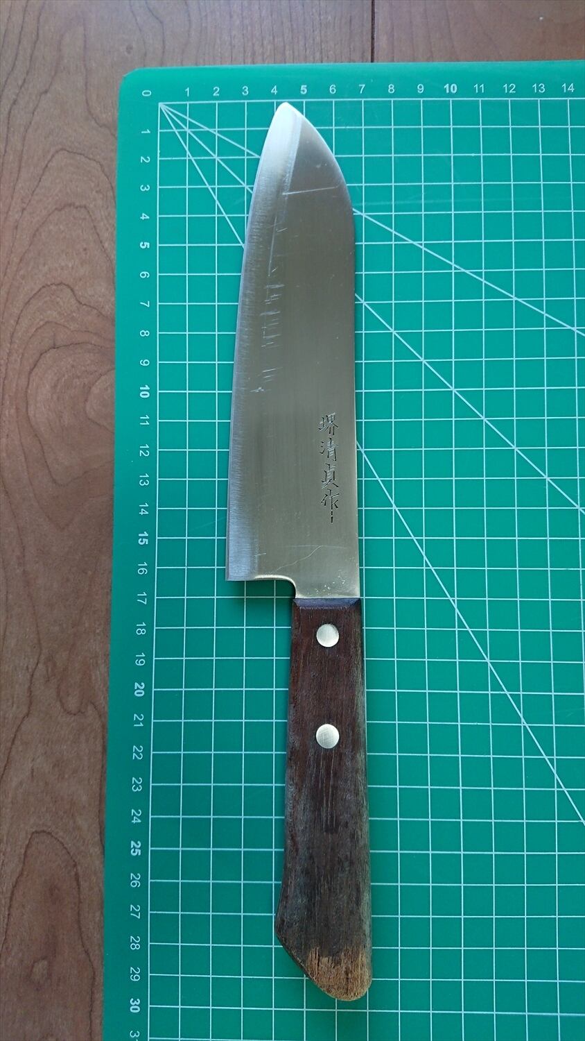 1. o768/銘:堺清貞作/三徳包丁(両刃)/峰厚:1.4/重量:110/作り:ステンレス?/他: