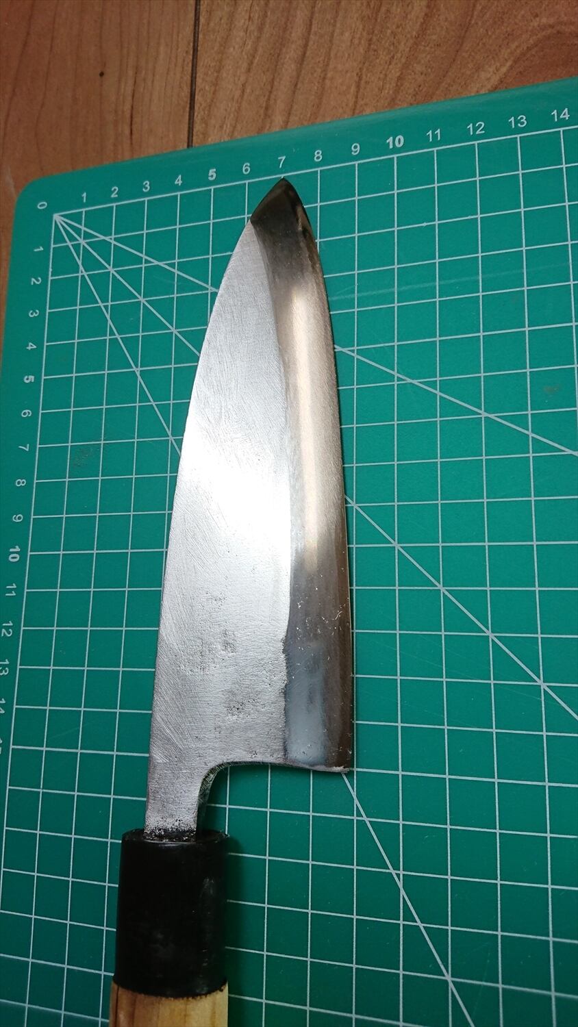 1. o873/銘:武光/出刃包丁(片刃)/峰厚:7.8/重量:214/作り:鋼? 特級/他:柄に一部ヒビがあったが当社にて補修済み