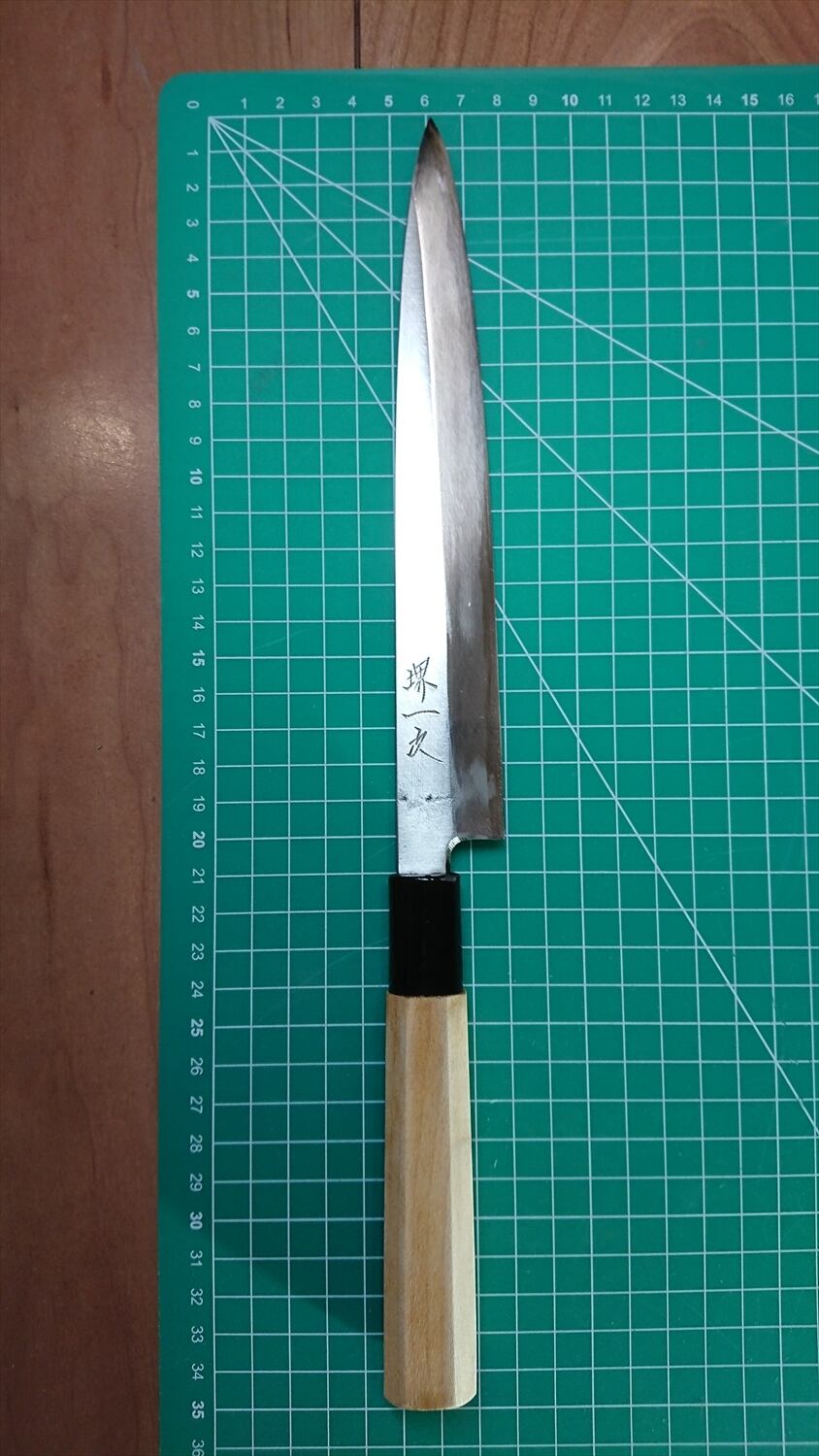 1. o892/銘:堺一次/刺身包丁(片刃)/峰厚:3.5/重量:117/作り:白鋼/他:
