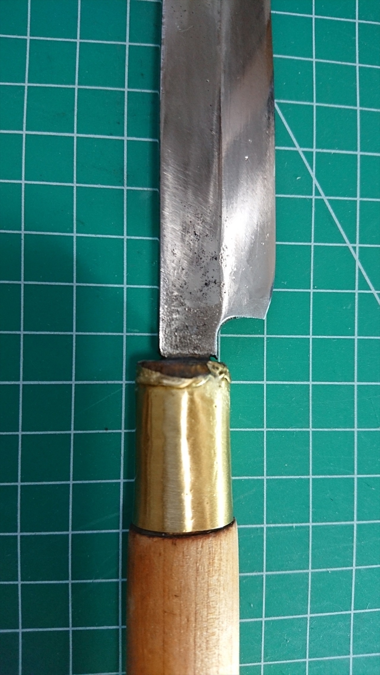 1. o896/銘:銘?/刺身包丁(片刃)/峰厚 アゴ上:2.9/重量:88/作り:鋼?/他:口金にヨレあり。裏に大きな腐食除去痕あり