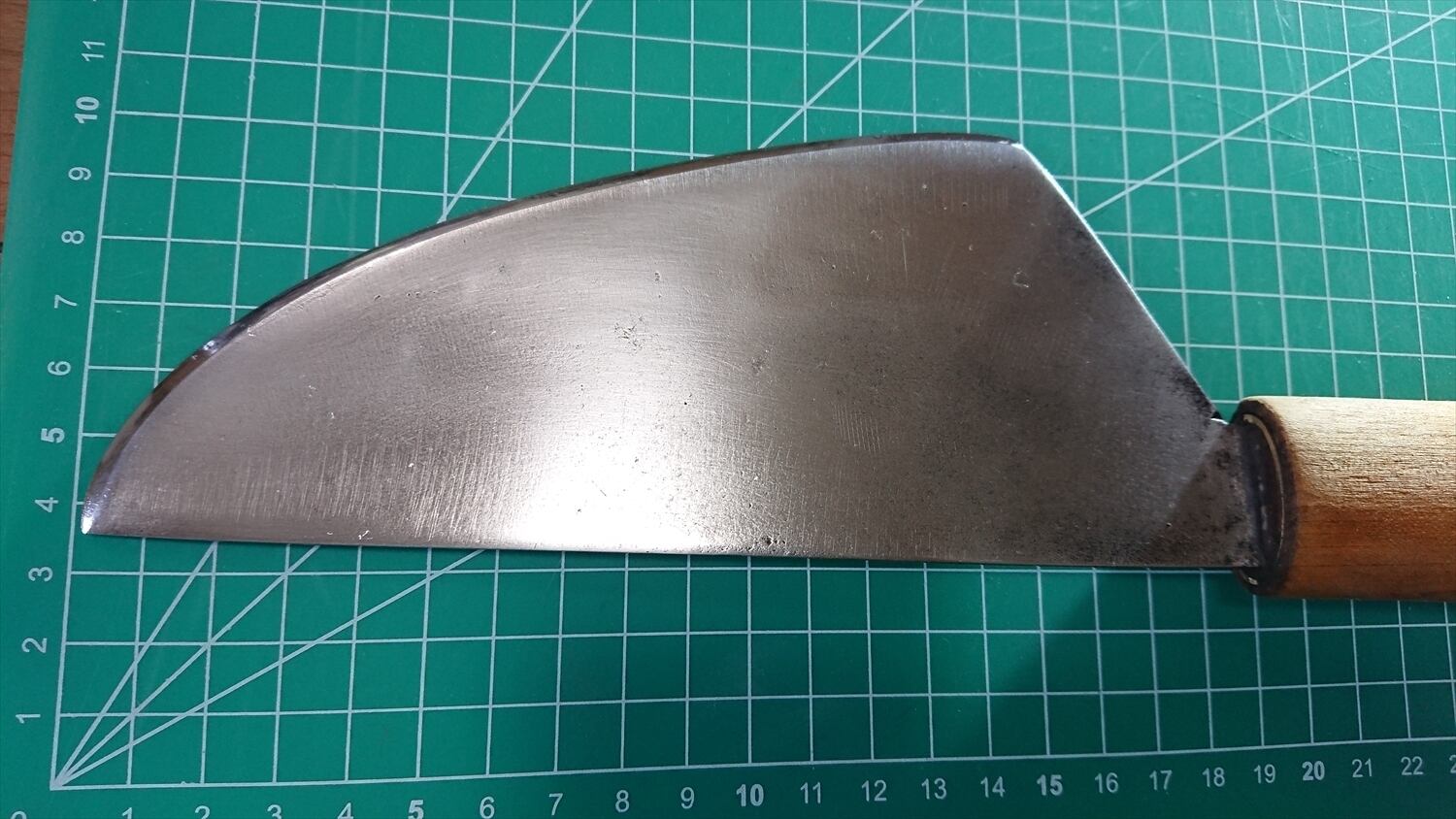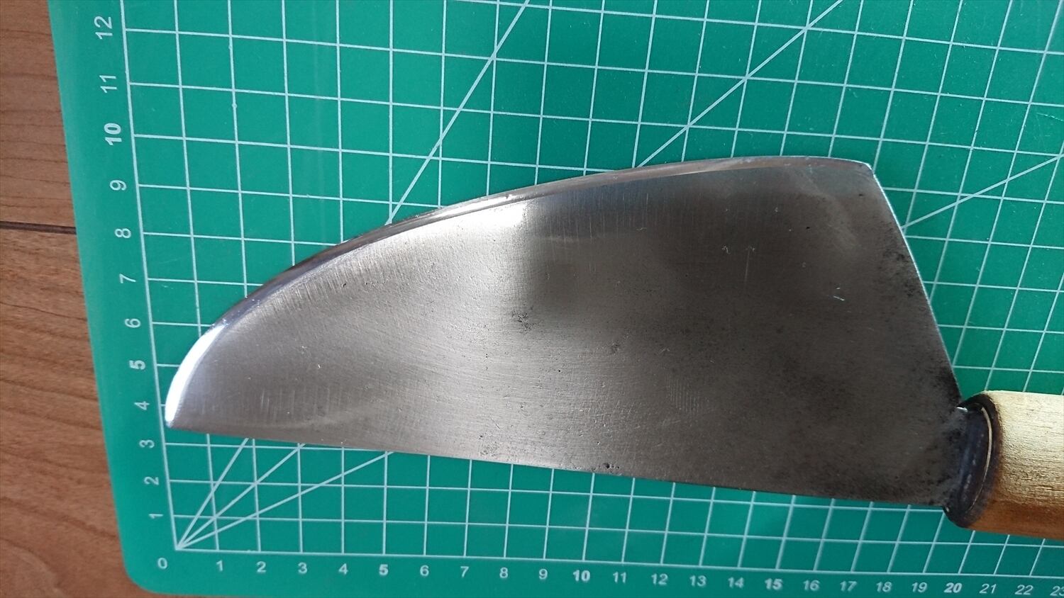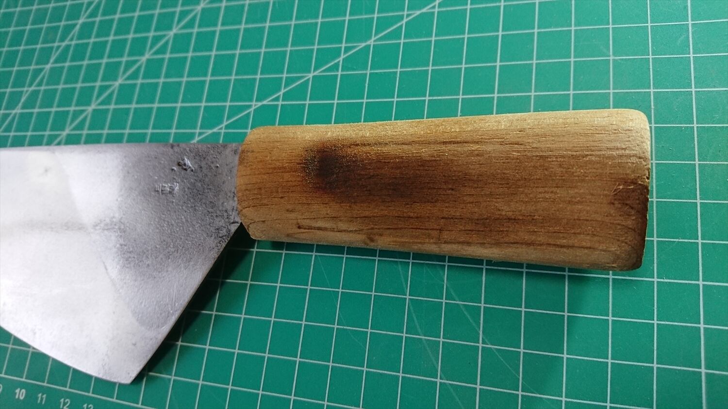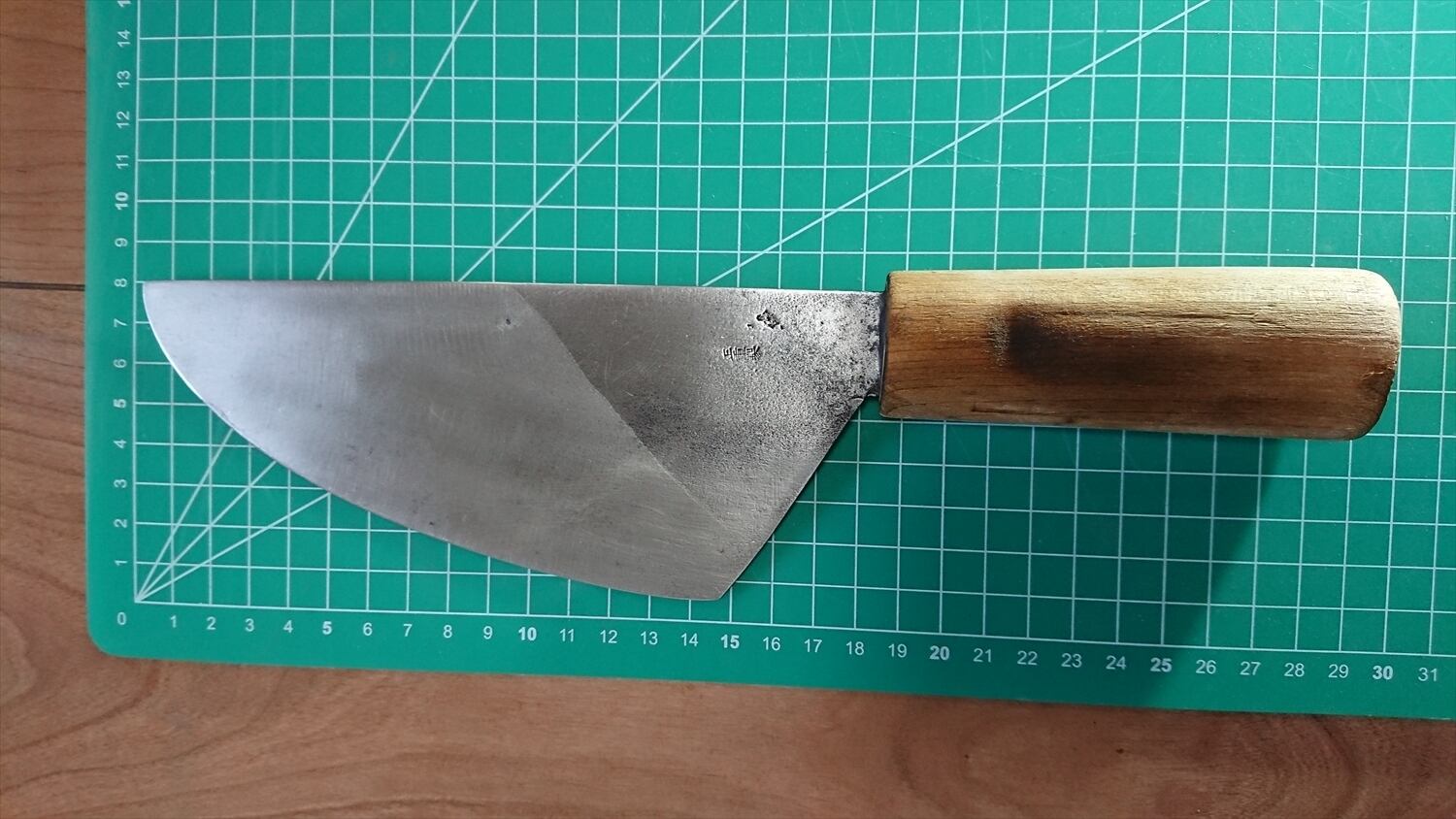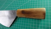 1. o961/銘:正重製/特殊包丁(両刃 約左1:右9)/峰厚 アゴ上:1.9/重量:175/作り:鋼?/他:黒い部分は黒塗装または黒打ちの名残