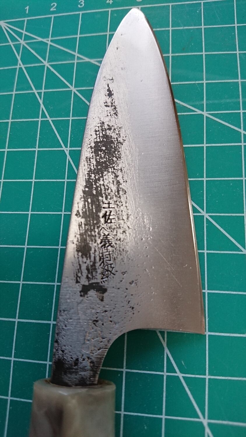 1. o980/銘:土佐義/あじ切り包丁(両刃)/峰厚 アゴ上:2.9/重量:57/作り:鋼? 特級/他:黒い部分は黒塗装または黒打ちの名残