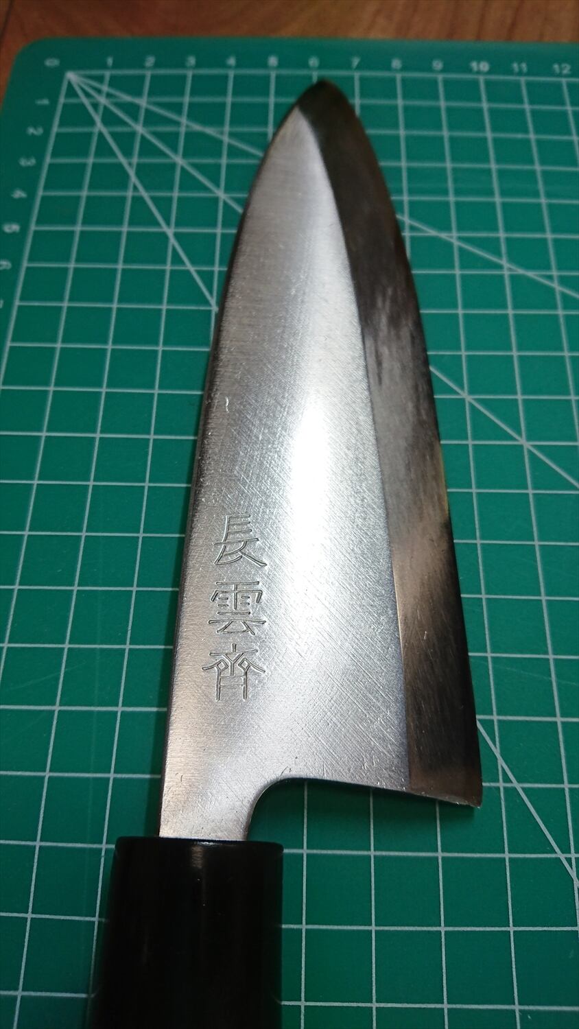 1. o928/銘:長雲齊/出刃包丁(片刃)/峰厚 アゴ上:7.9/重量:293/作り:鋼? 火造り 本鍛錬/他: