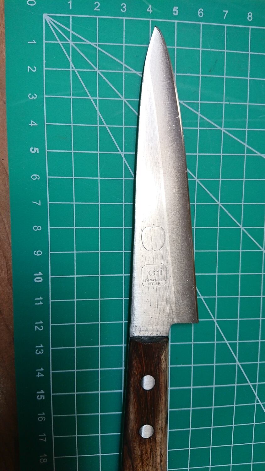 1. o1022/銘:Kai/ペティナイフ(両刃)/峰厚 アゴ上:1.3/重量:42/作り:STAINLESS STEEL/他: