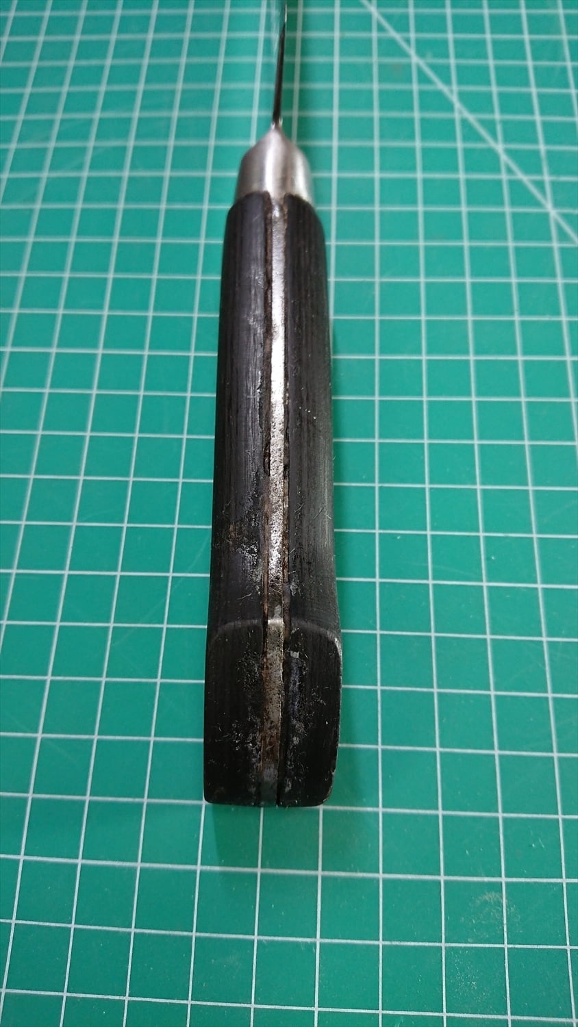 1. o1040/銘:兼広作/筋引包丁(両刃 約左1:右9)/峰厚 アゴ上:2.2/重量:226/作り:鋼?/他:柄と中子の間に少々隙間があるが当社にて穴埋め補修済み