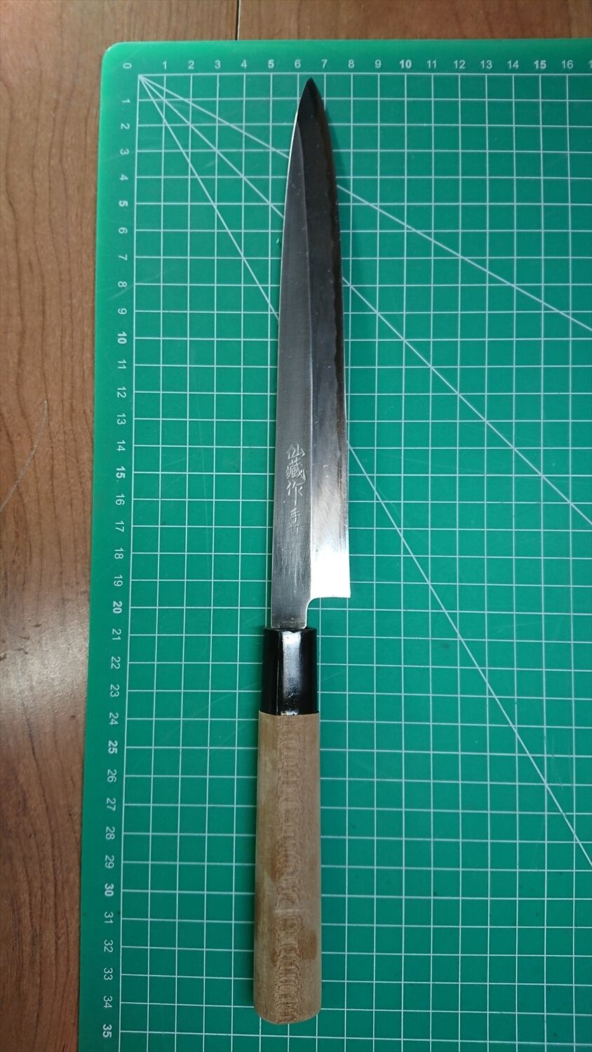 1. o1053/銘:仙蔵作/刺身包丁(片刃)/峰厚 アゴ上:3.5/重量:113/作り:鋼? 手打/他: