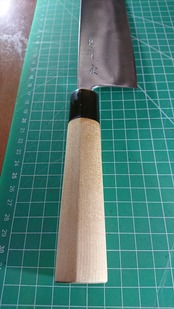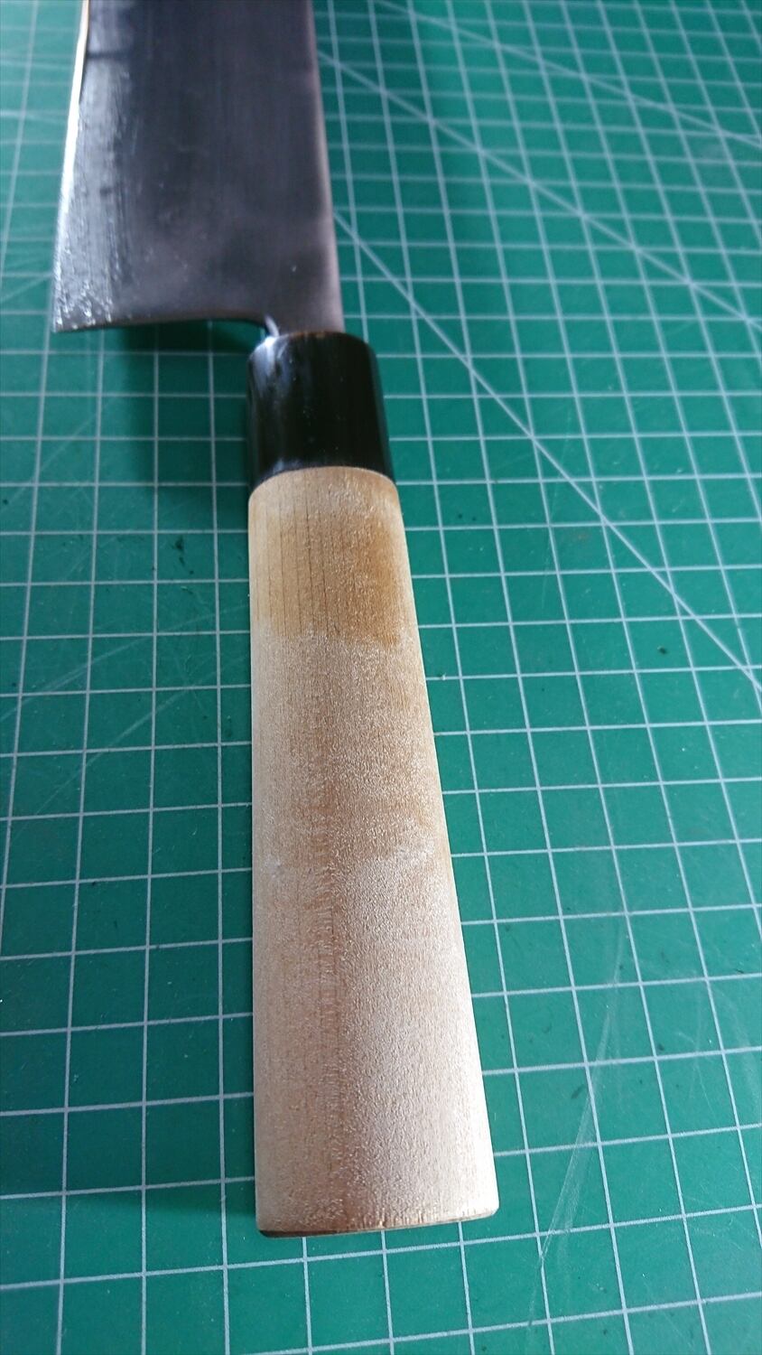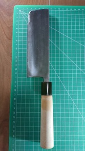 1. o1010/銘:有次/菜切包丁(両刃)/峰厚 アゴ上:3.4/重量:212/作り:鋼?/他:口輪に一部虫食いがあったが当社にて補修済み