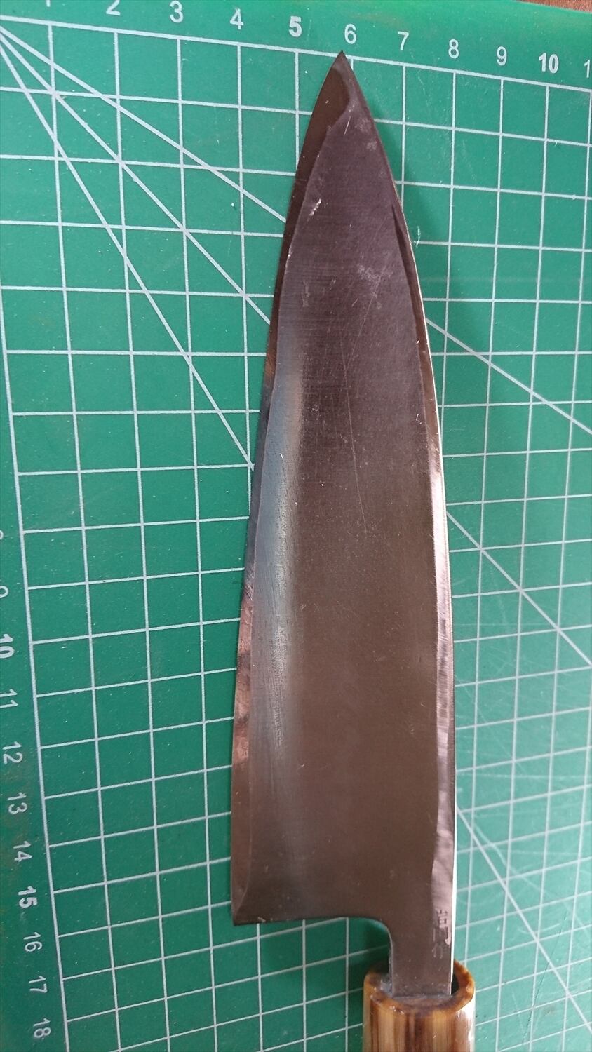 1. o1032/銘:堺刀司/出刃包丁(片刃)/峰厚 アゴ上:8/重量:272/作り:鋼? 岩国作/他:柄に割れあり。当社にて補修済み
