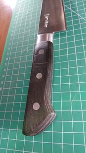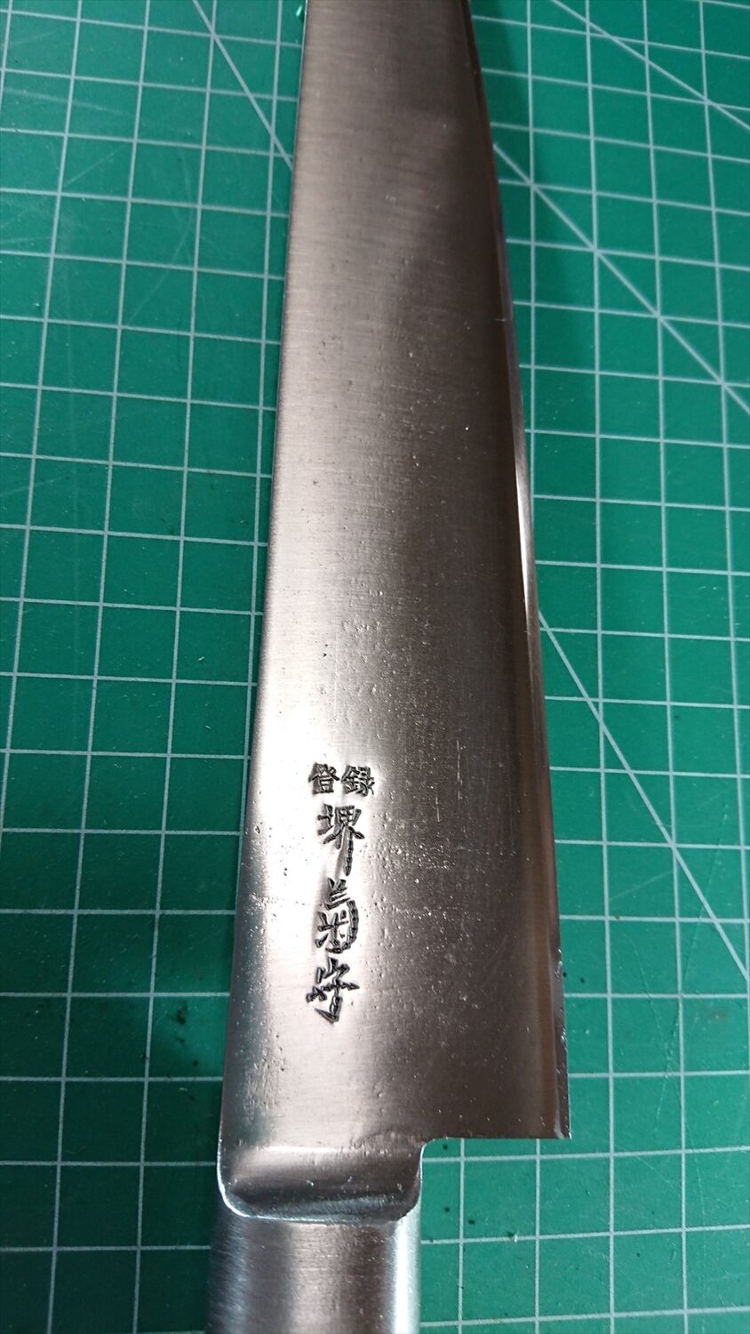 1. o1035/銘:堺菊守/牛刀(両刃 約左1:右9)/峰厚 アゴ上:2/重量:208/作り:日本鋼/他: