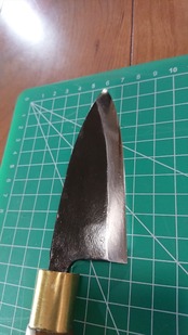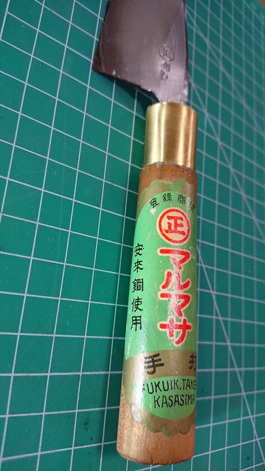 1. o1049/銘:マルマサ/あじ切り包丁(片刃)/峰厚 アゴ上:3.6/重量:70/作り:手打 別打 安来鋼使用/他:柄はクリーニング未(シールが剥がれるため)