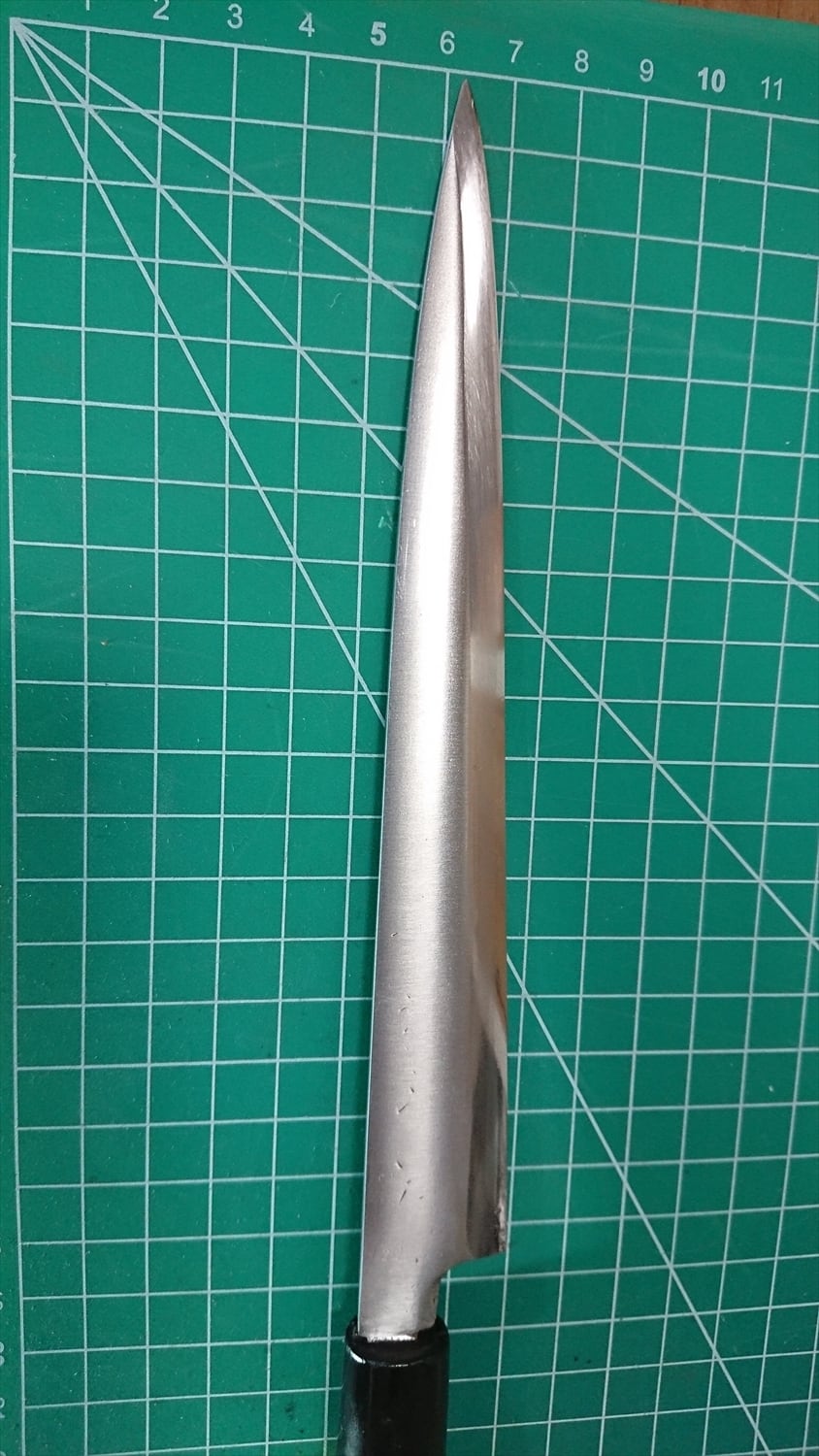 1. o1090/銘:堺成光/筋引包丁?(両刃 約 左1:右9)/峰厚 アゴ上:3.9/重量:100/作り:鋼? 特製 手造/他: