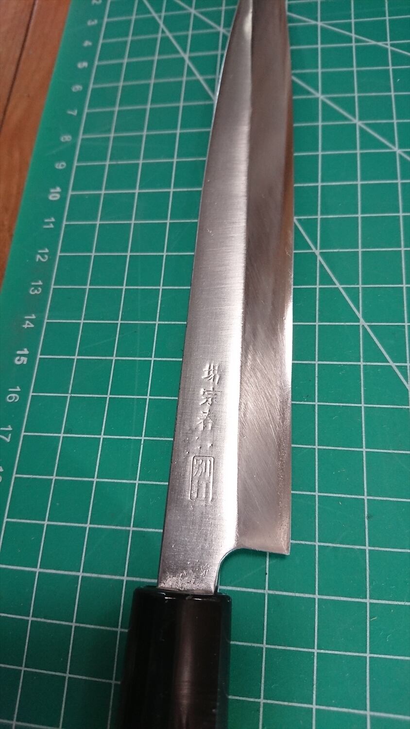 1. o1141/銘:堺宗春/刺身包丁(片刃)/峰厚 アゴ上:3.3/重量:106/作り:別打(白鋼?)/他:柄は当社にて新品と交換済み