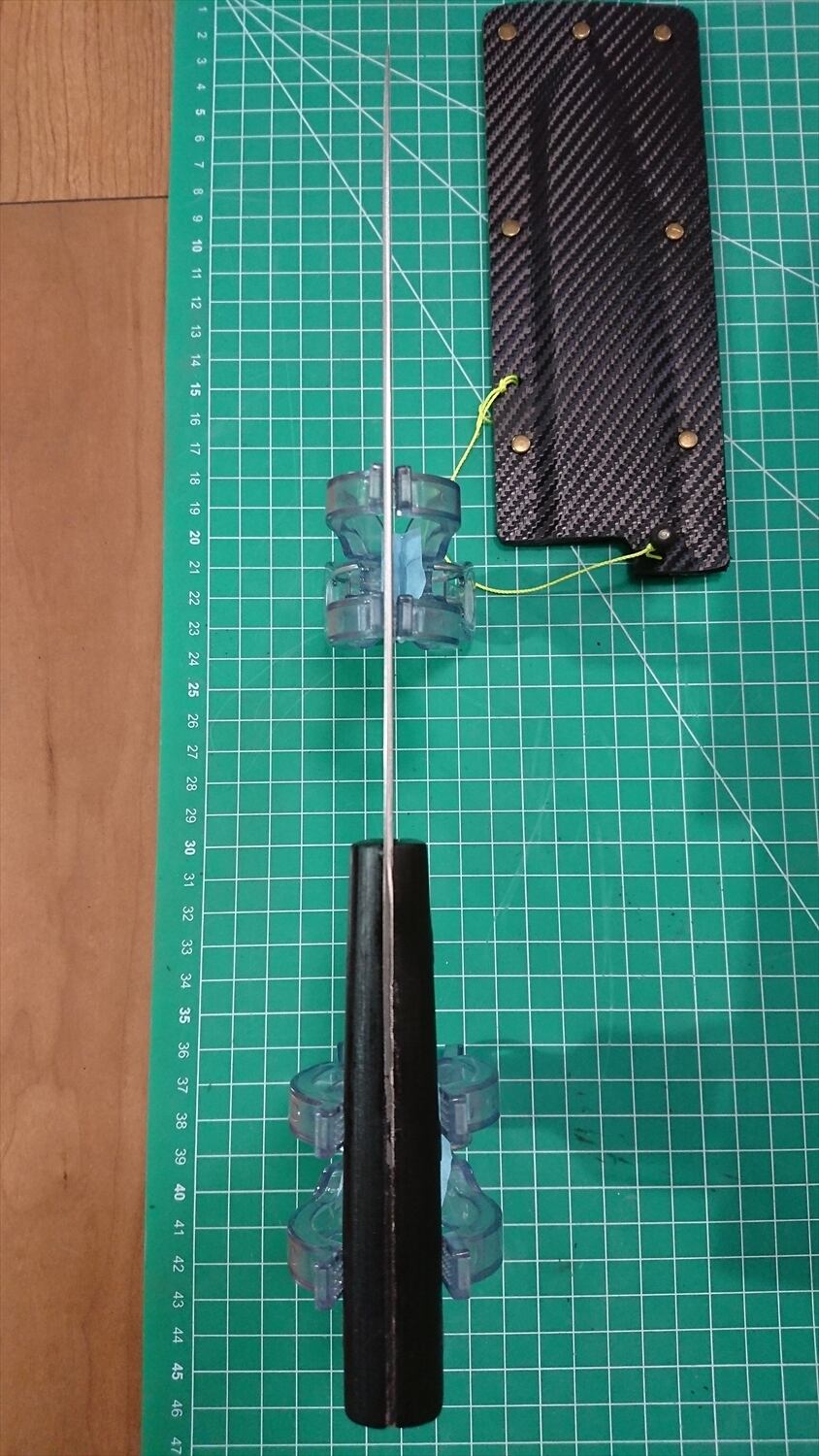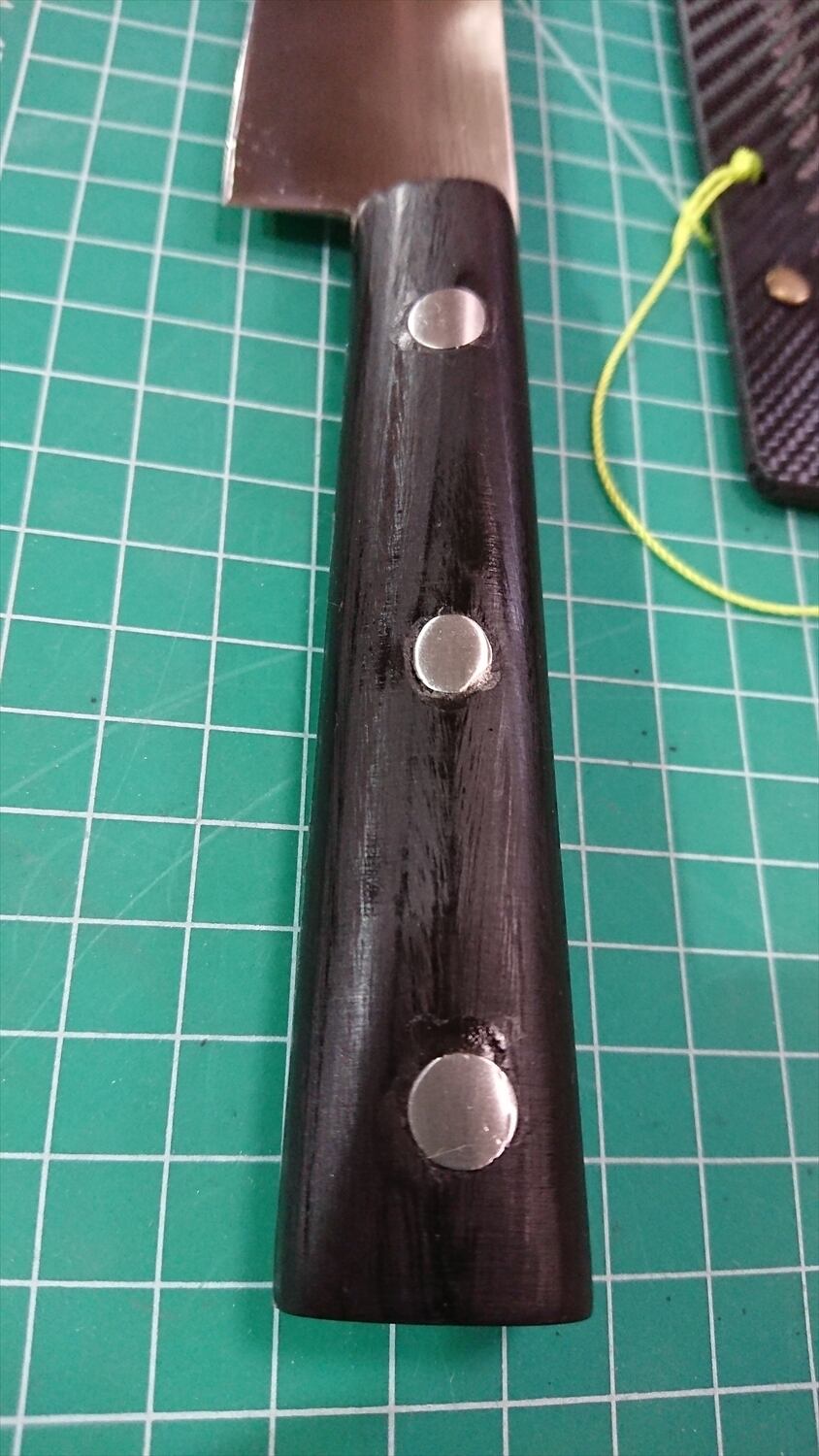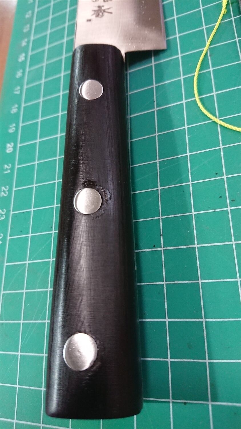 1. o1148/銘:銀香/三徳包丁(両刃)/峰厚 アゴ上:1.7/重量:130/作り:スウェーデン・ステンレス刃物鋼/他:当社自作の丈夫で清潔なサヤ(カイデックス素材)付き。柄やかしめにスキマや浮きが少々あるが、当社にて補修済み