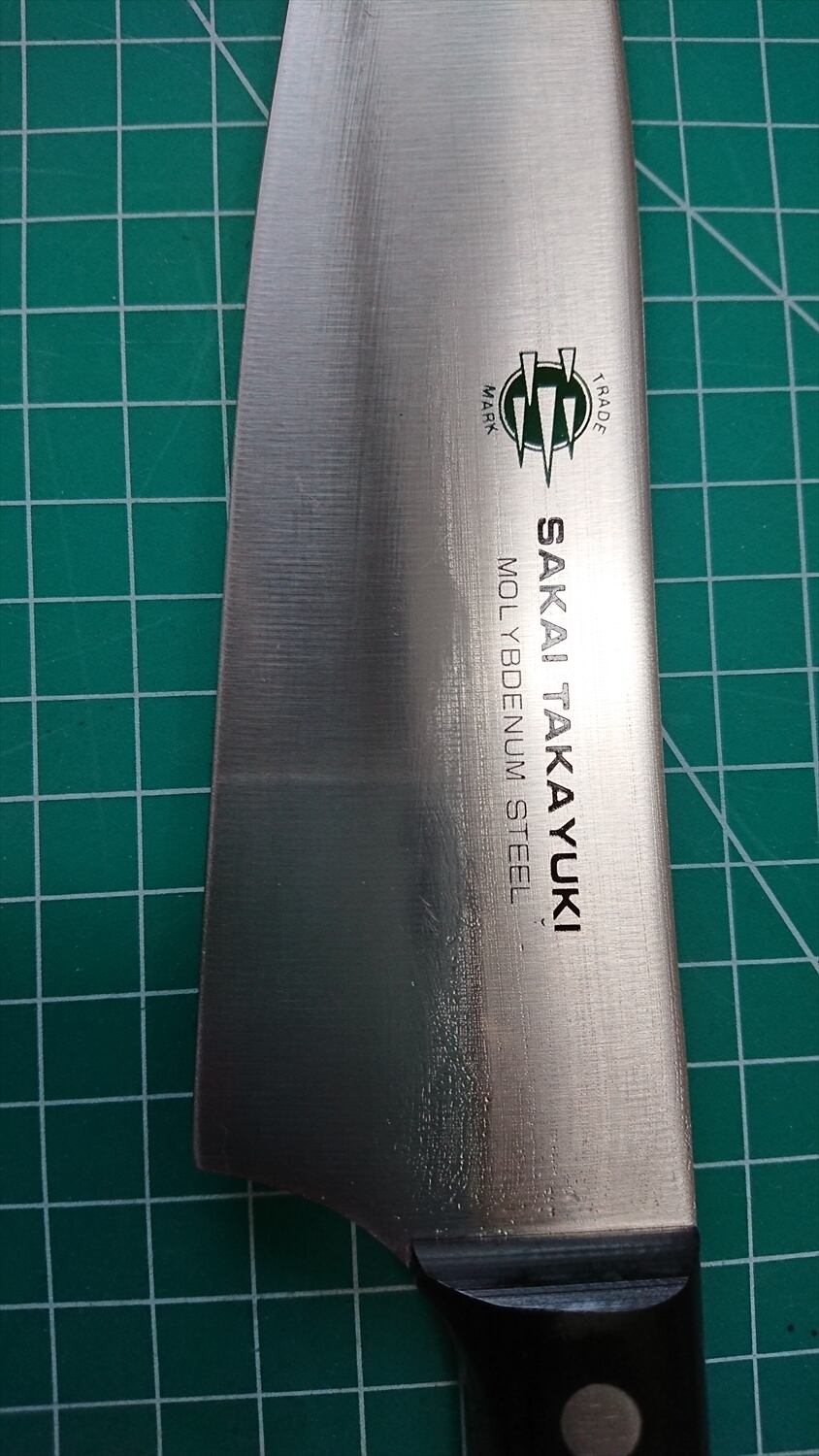 1. o1193/銘:堺孝行/牛刀(両刃)/峰厚 アゴ上:1.6/重量:/作り:モリブデン鋼/他:写真内の箱付き
