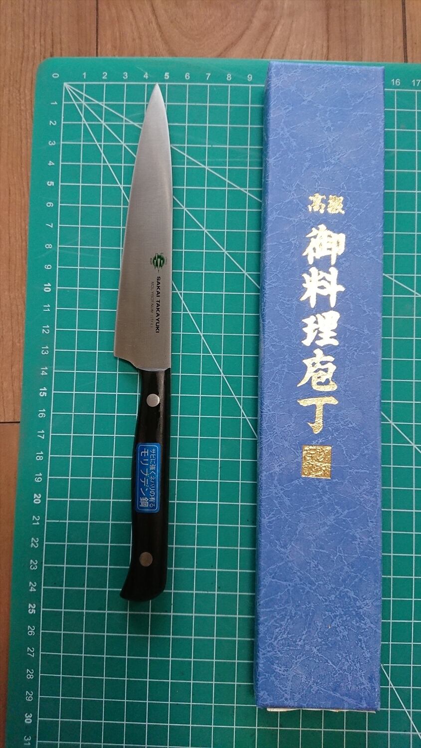 1. o1194/銘:堺孝行/ペティナイフ(両刃)/峰厚 アゴ上:1.4/重量:59/作り:モリブデン鋼/他:写真内の箱付き
