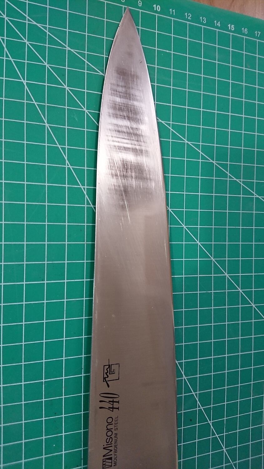 1. o1200/銘:Misono440/牛刀(両刃)/峰厚 アゴ上:2.4/重量:264/作り:MOLYBDENUM STEEL/他: