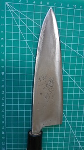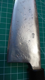 1. o966/銘:銘?/相出刃包丁(両刃)/峰厚 アゴ上:8.3/重量:241/作り:鋼? 特製/他: