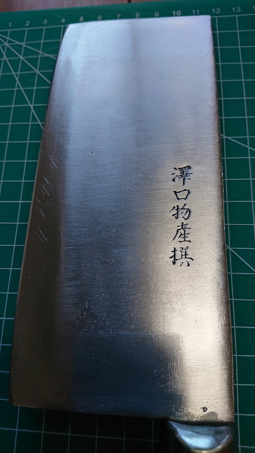 1. o1082/銘:澤口物産撰/中華包丁(両刃)/峰厚 アゴ上:2.8/重量:341/作り:鋼?/他: