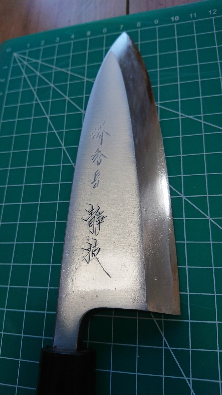 1. o1158/銘:堺秀岳/出刃包丁(片刃)/峰厚 アゴ上:8.2/重量:225/作り:鋼?/他:「静枝」?と彫りあり