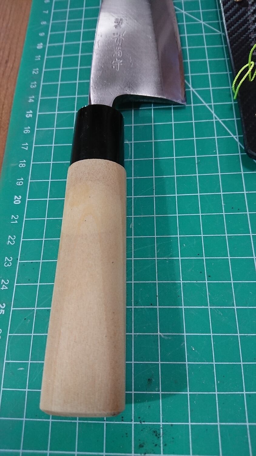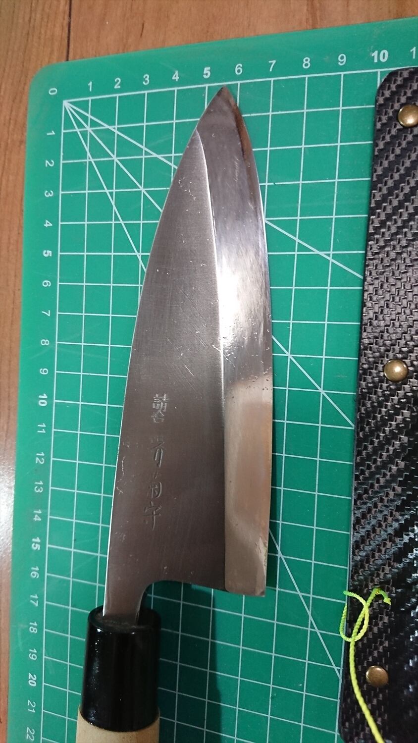 1. o1161/銘:堺菊守/出刃包丁(片刃)/峰厚 アゴ上:7.8/重量:261/作り:鋼?/他:当社自作の丈夫で清潔なサヤ(カイデックス素材)付き。