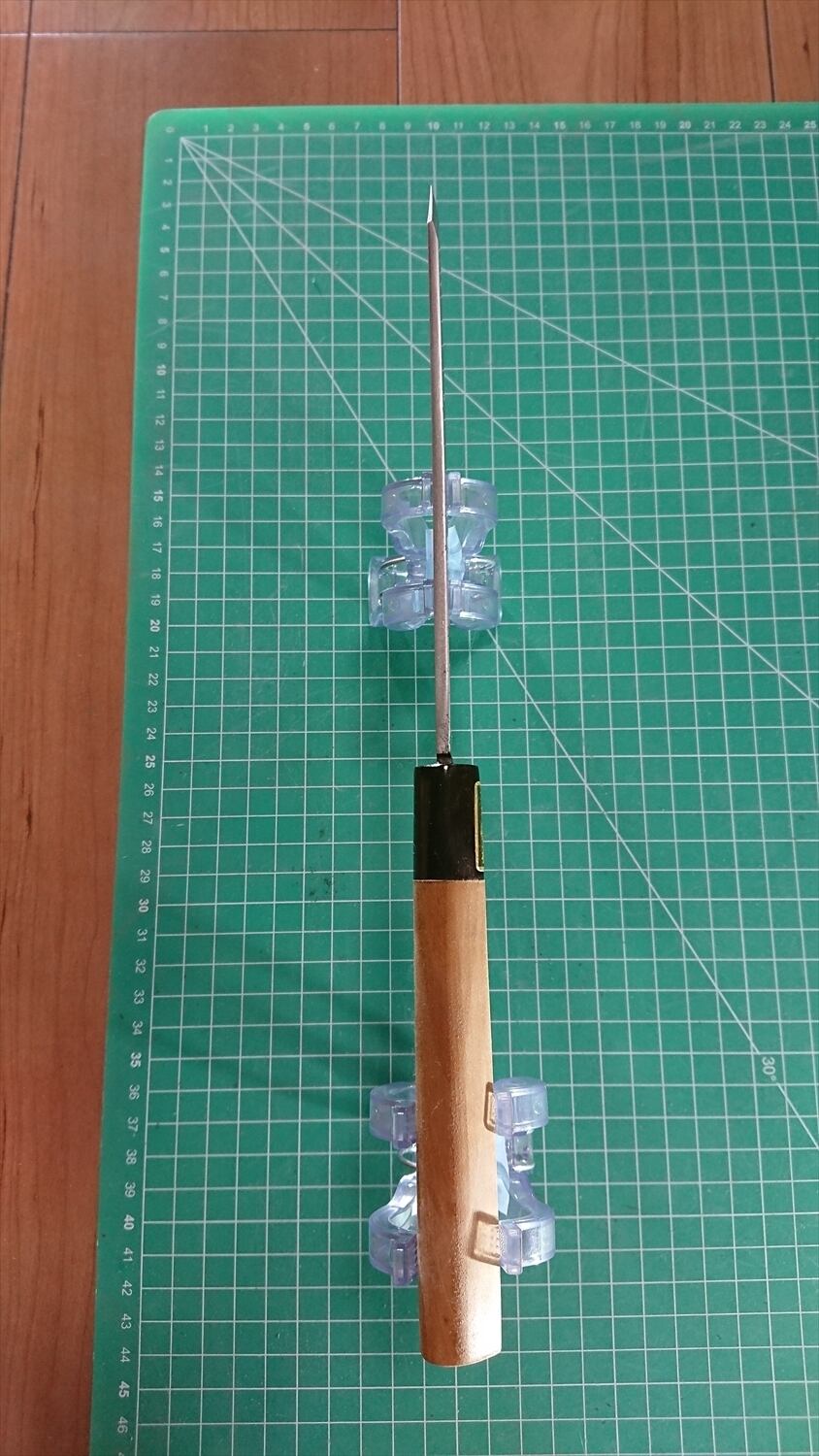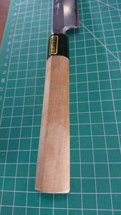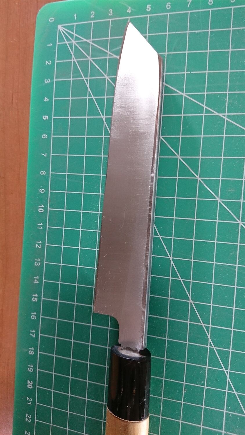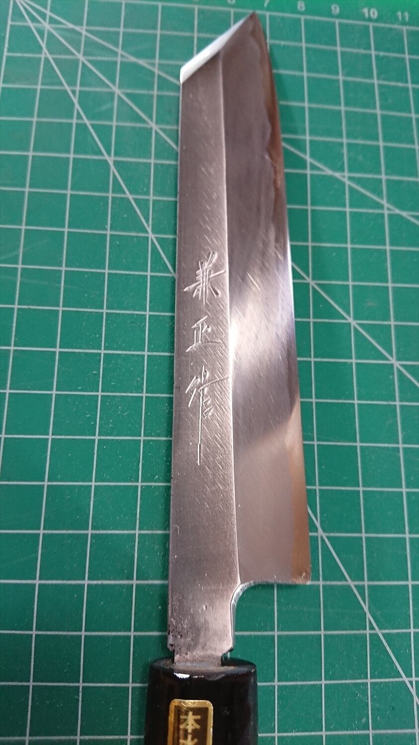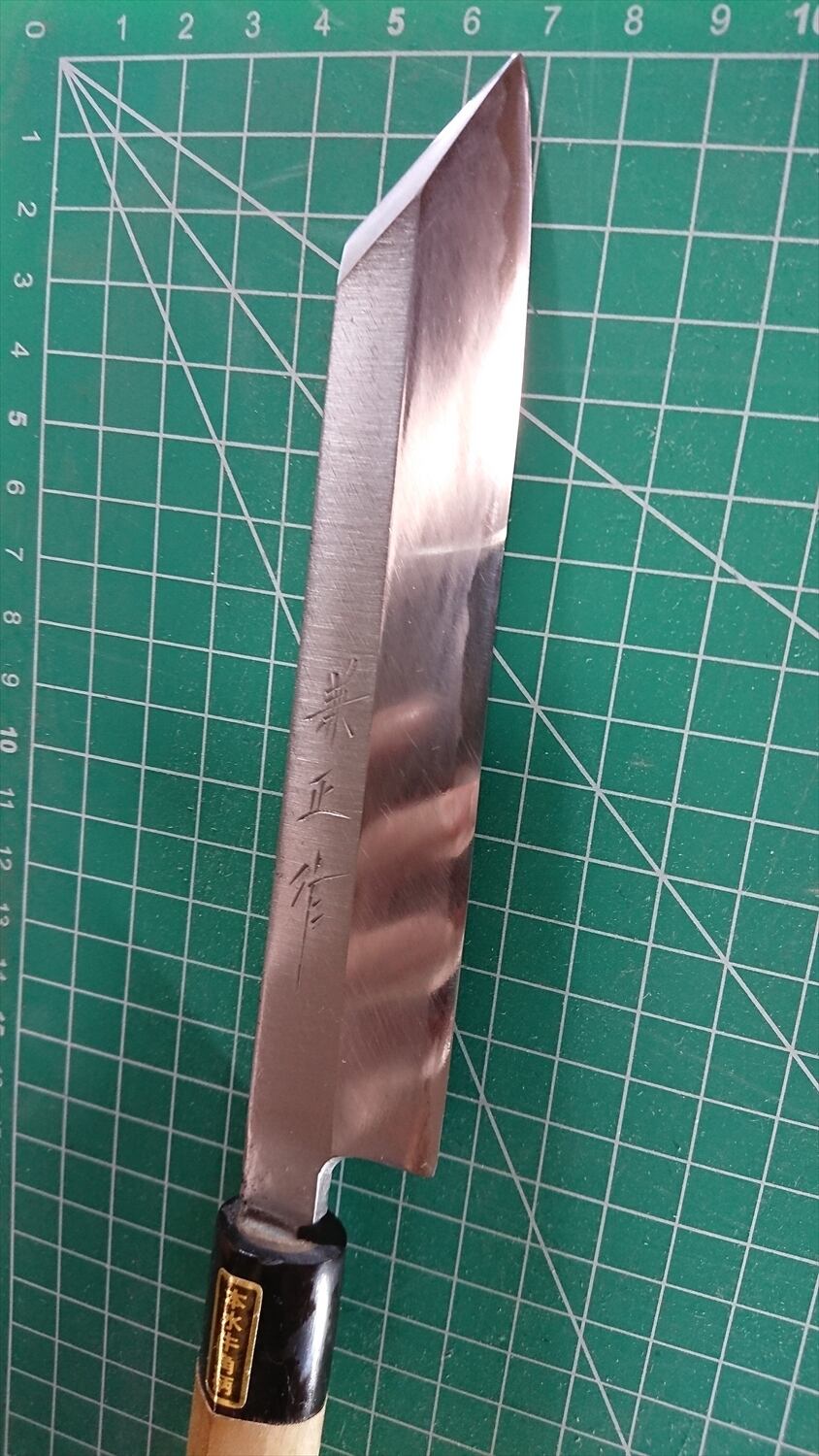 1. o1253/銘:兼正作/刺身包丁(片刃)/刃長:150/峰厚 アゴ上:3.7/重量:-(131)/作り:鋼?/他:本水牛角柄。曲がり修正時に鋼が割れてしまった為、割れた部分から先をちょん切り整形済み