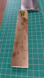 1. o1254/銘:兼正作/出刃包丁(片刃)/刃長:165/峰厚 アゴ上:8.5/重量:286/作り:鋼?/他:本水牛角柄。柄から先が右に曲がっている?
