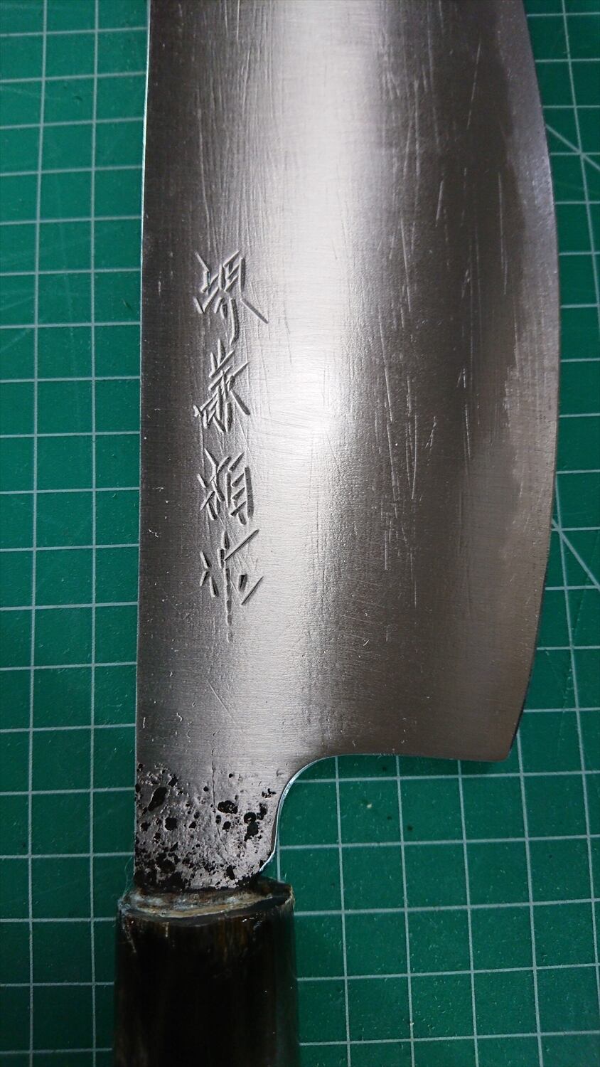 1. o1083/銘:堺兼頼作?/寿司切り包丁(両刃)/刃長:225/峰厚 アゴ上:3.3/重量:377/作り:鋼?/他: