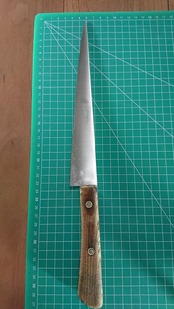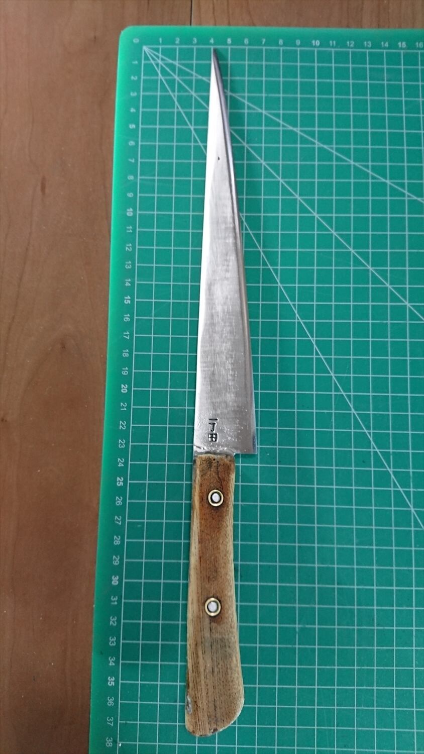 1. o1215/銘:一丁田/筋引包丁(両刃 約 左1:右9)/刃長:235/峰厚 アゴ上:2.8/重量:118/作り:鋼?/他:柄に虫食いあったが当社にて補修済み