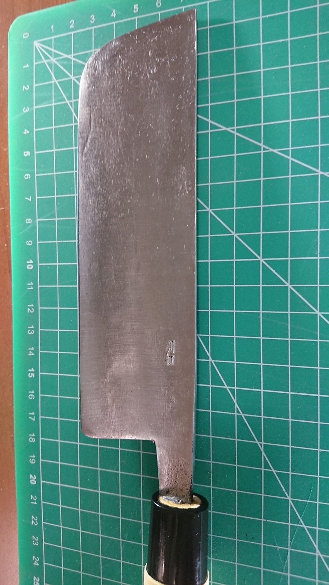 1. o1283/銘:銘?/菜切包丁(両刃)/刃長:170/峰厚 アゴ上:3.4/重量:135/作り:鋼? 別打/他:柄は当社にて新品と交換済み