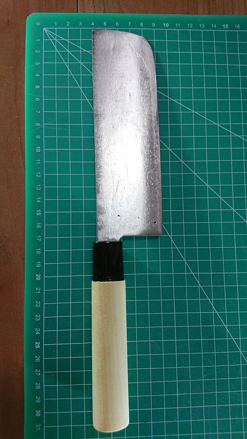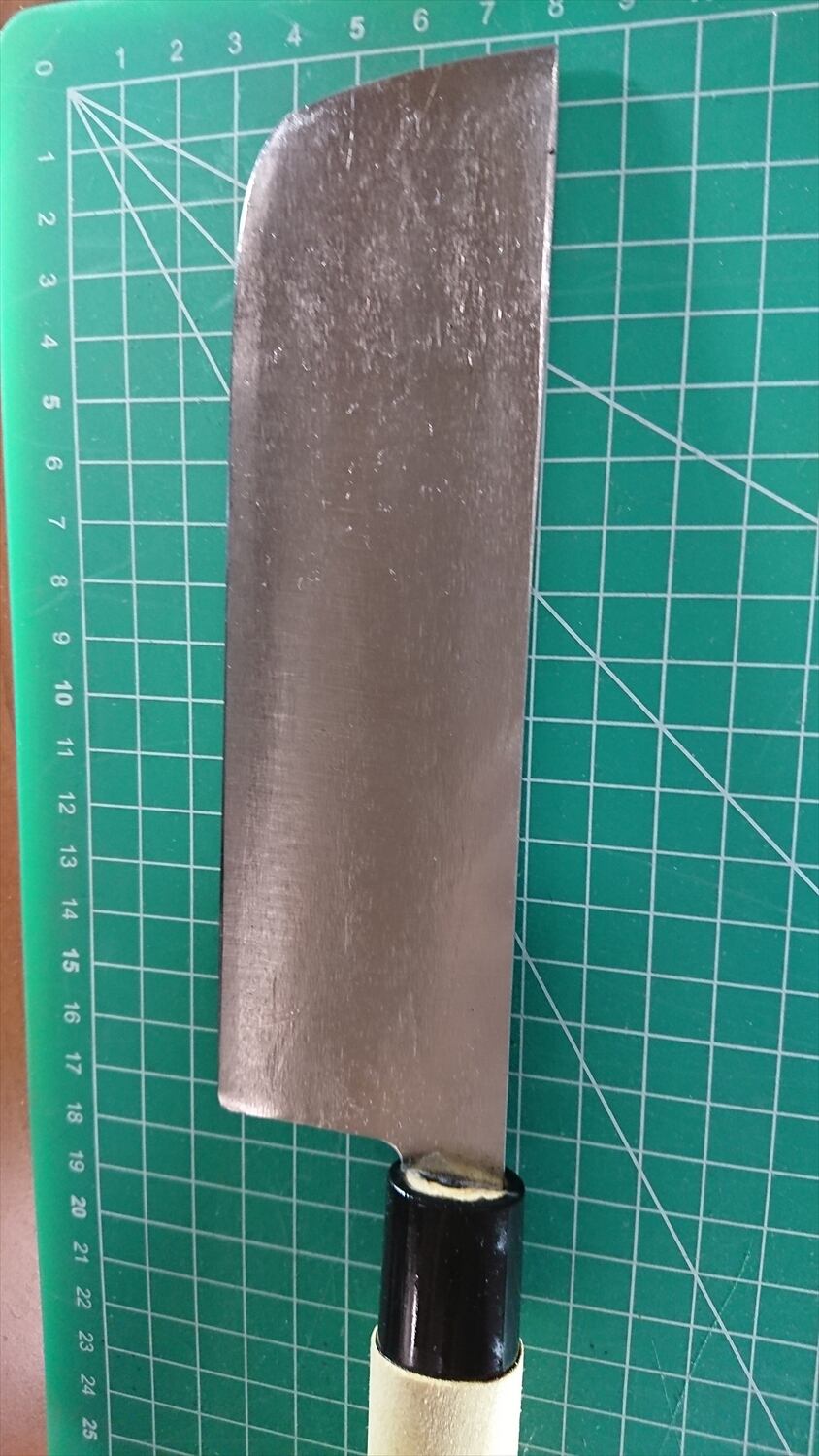 1. o1284/銘:銘?/菜切包丁(両刃)/刃長:170/峰厚 アゴ上:1.4/重量:113/作り:鋼?/他:柄は当社にて新品と交換済み