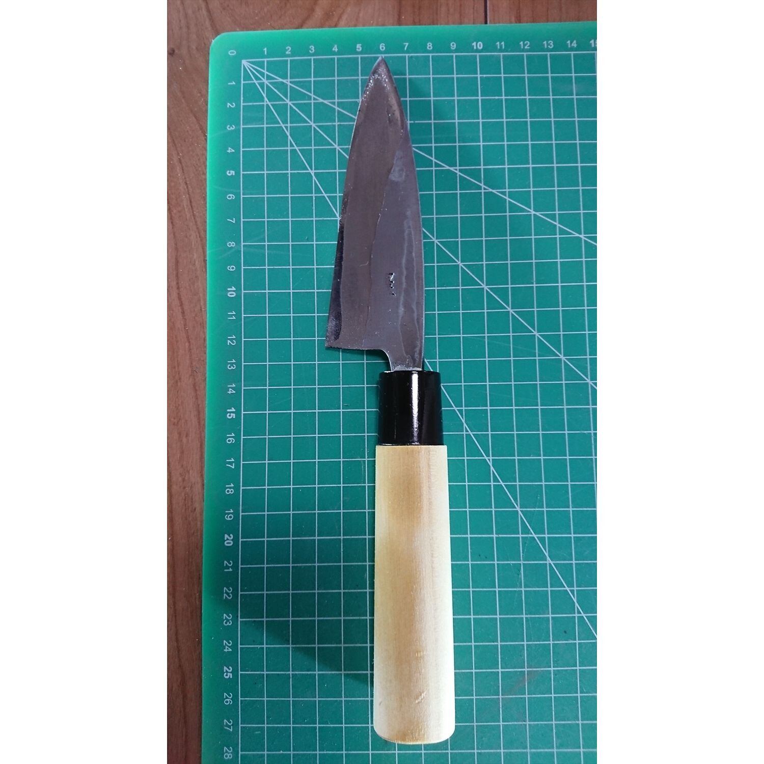 1. o1139/銘:銘?/出刃包丁(片刃)/刃長:125/峰厚 アゴ上:6.6/重量:125/作り:鋼?/他:柄は当社にて新品と交換済み