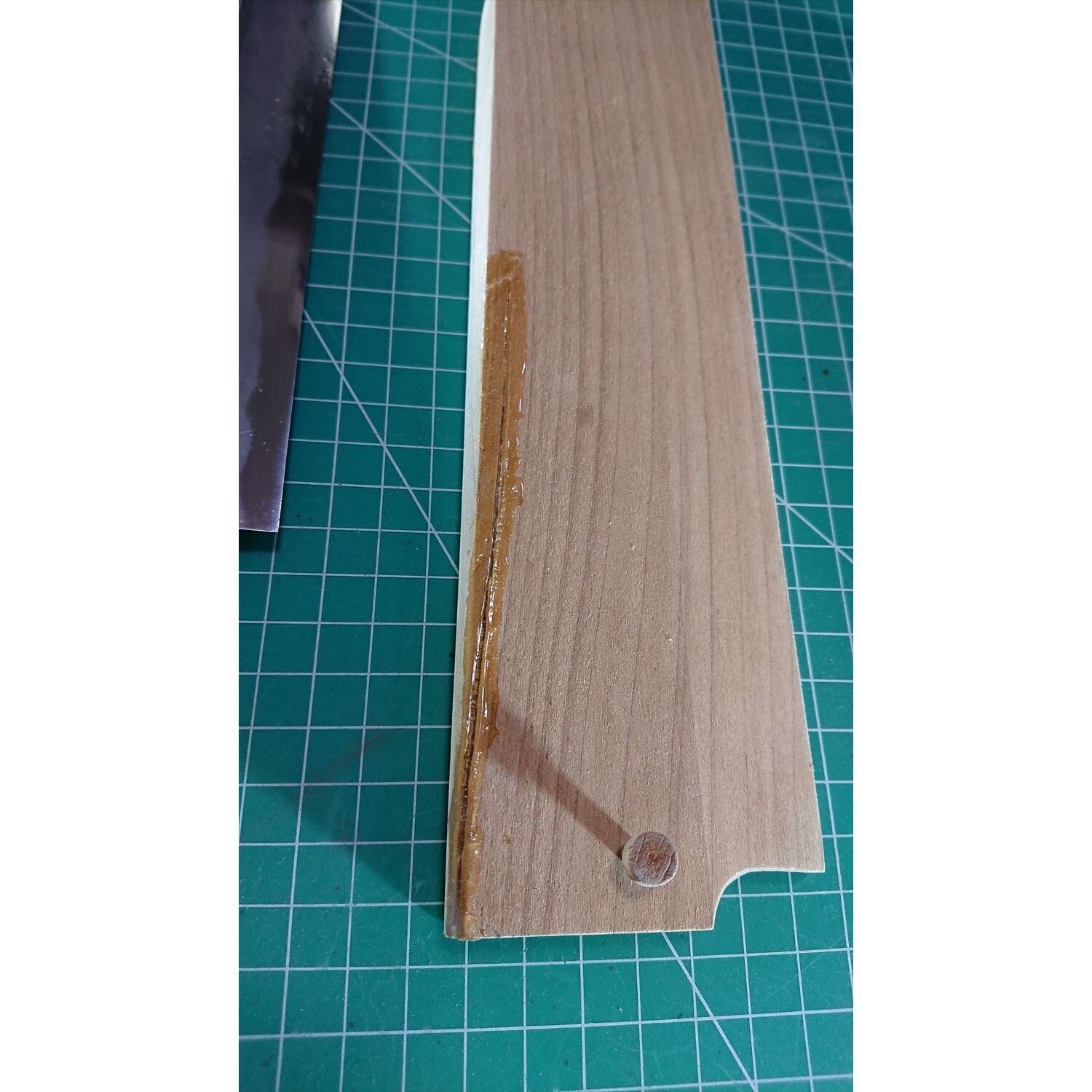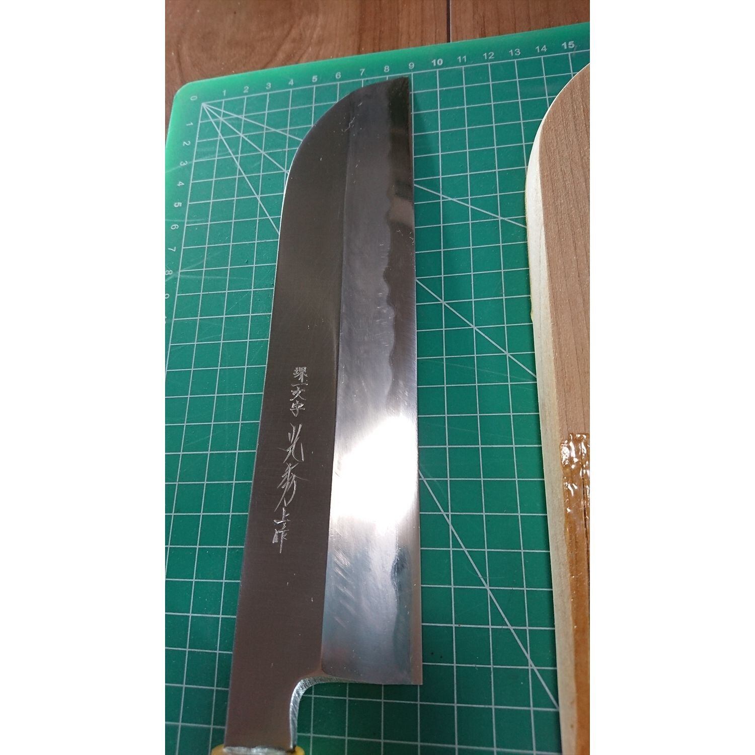 1. o1223/銘:堺一文字光秀/薄刃包丁(片刃)/刃長:210/峰厚 アゴ上:4.1/重量:266/作り:白鋼? 上作/他:ピン有りのサヤ付き。サヤに割れがあったが当社にて補修済み。