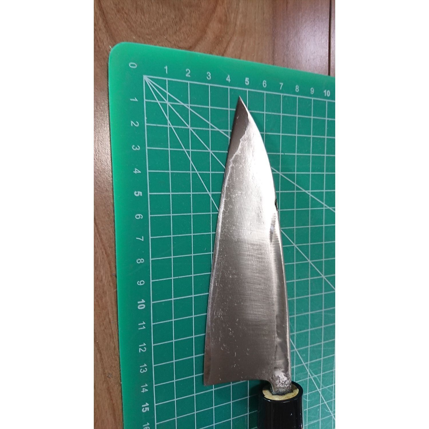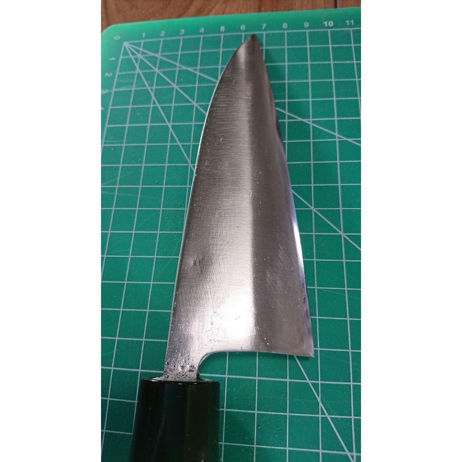 1. o1230/銘:銘?/出刃包丁(片刃)/刃長:140/峰厚 アゴ上:6.6/重量:172/作り:鋼?/他:柄は当社にて新品と交換済み