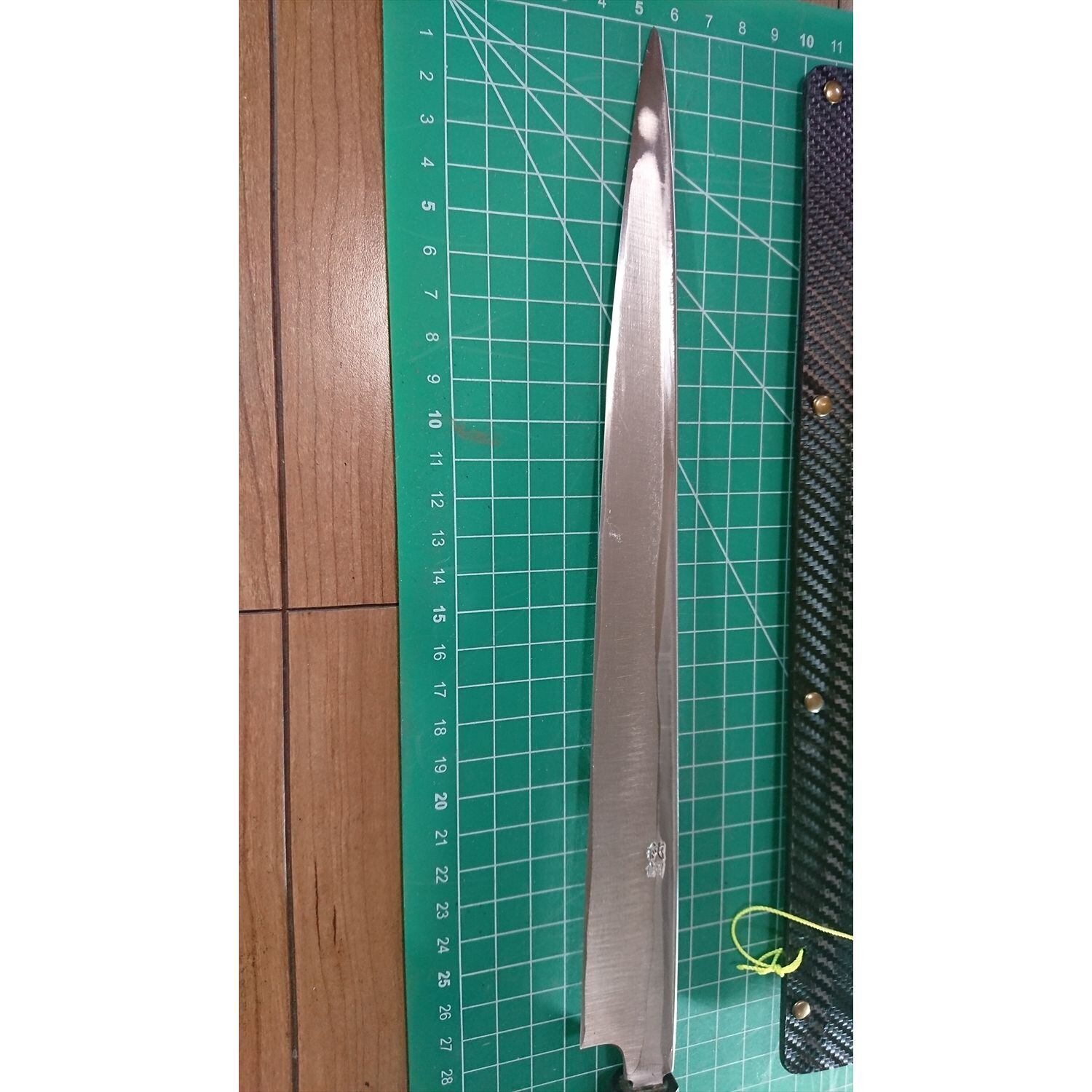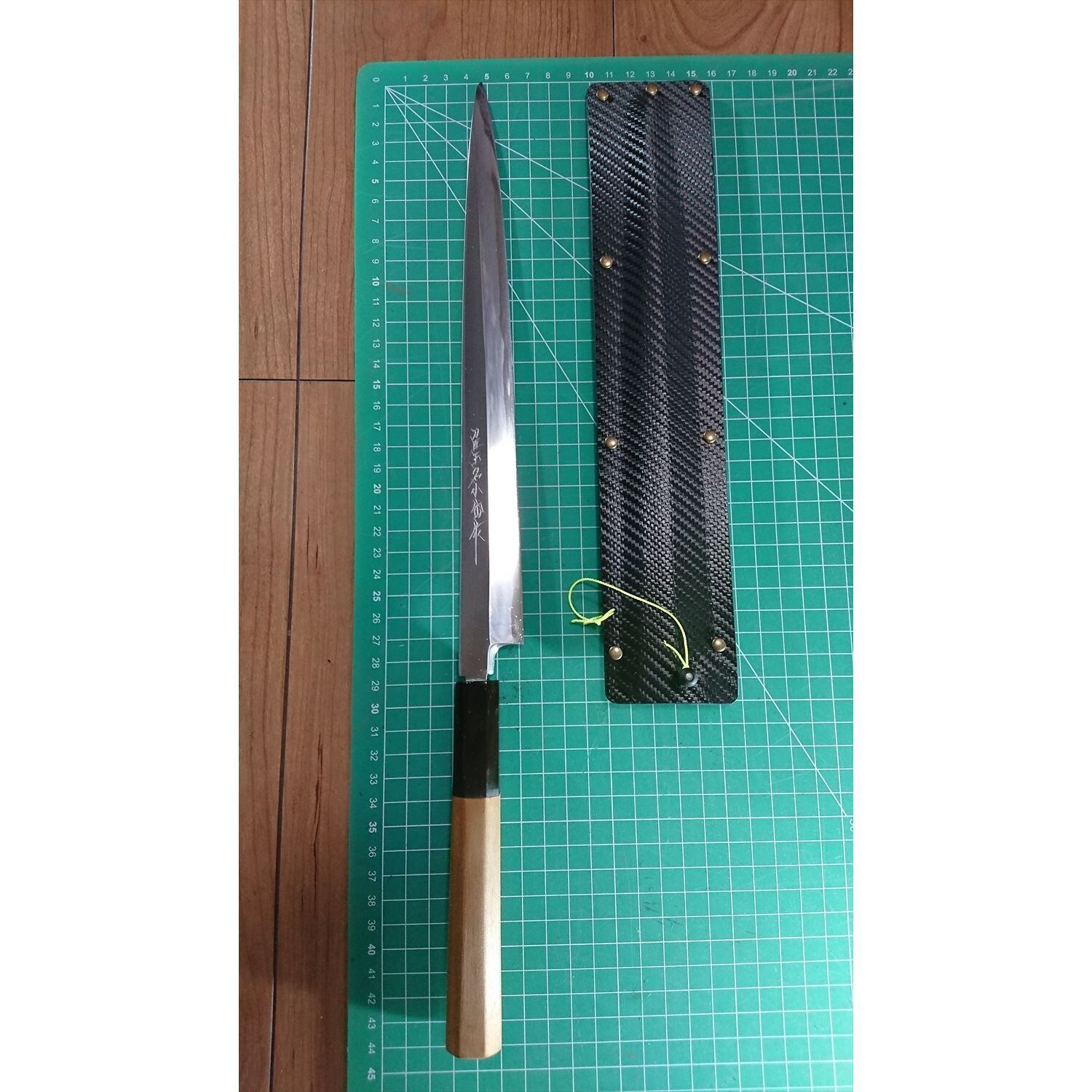 1. o1262/銘:刀匠玉名小岱作?/刺身包丁(片刃)/刃長:275/峰厚 アゴ上:3.2/重量:-(139)/作り:純鋼/他:八角柄。口輪に虫食いあったが当社にて補修済み。当社自作の丈夫で軽いサヤ(カイデックス素材)付き